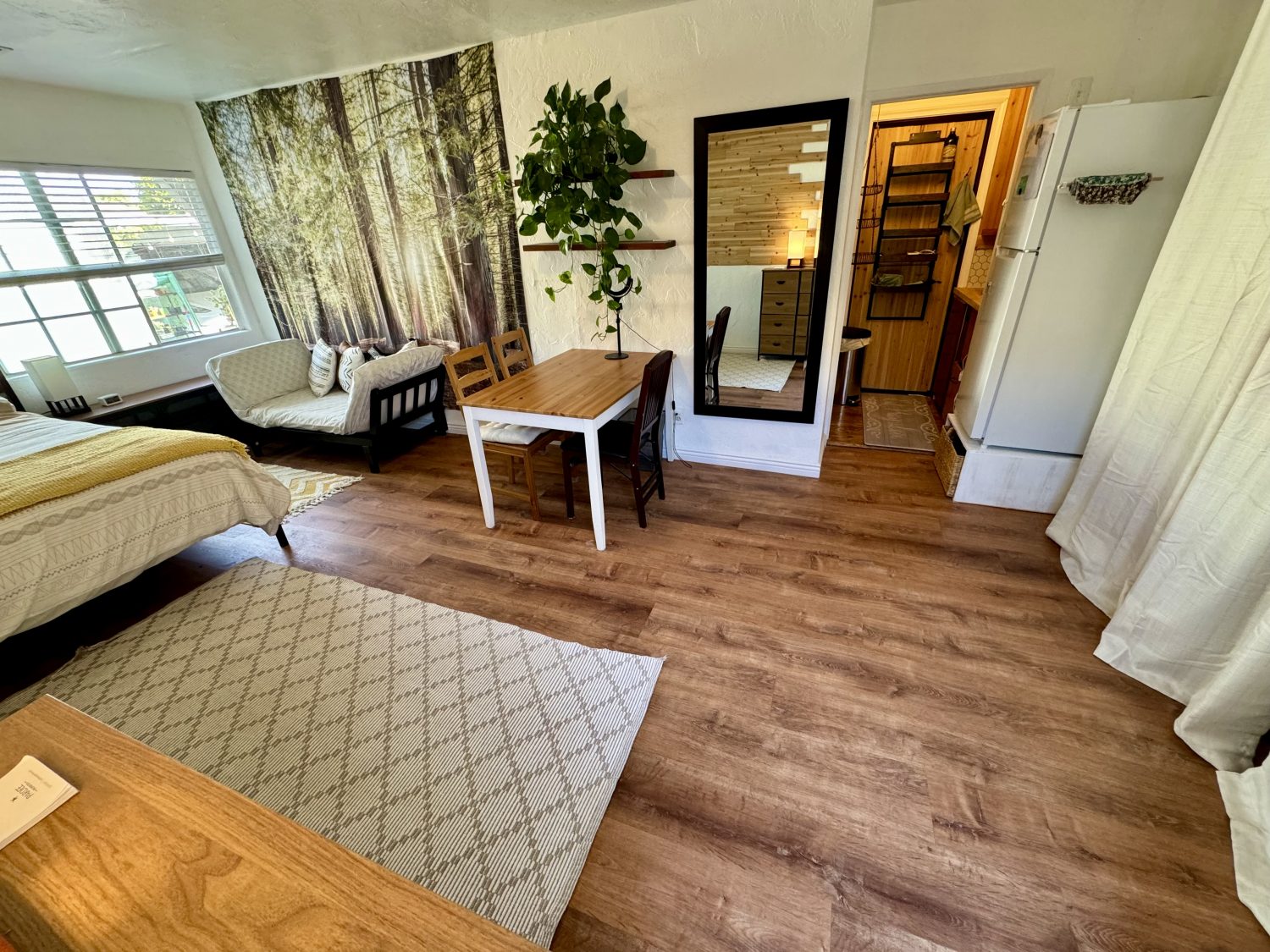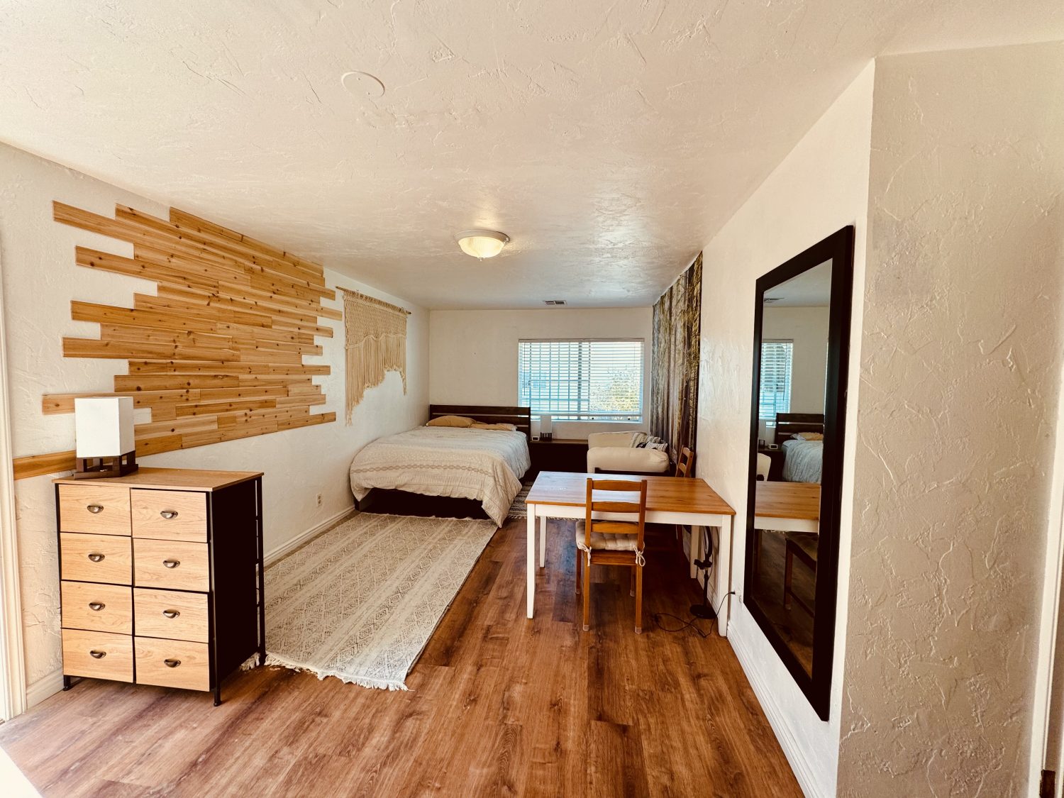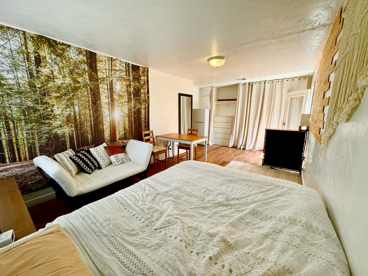 - Furnished with platform queen bed w under bed storage, 3 dressers, night stand with drawers, huge closet, futon couch, dining table.
