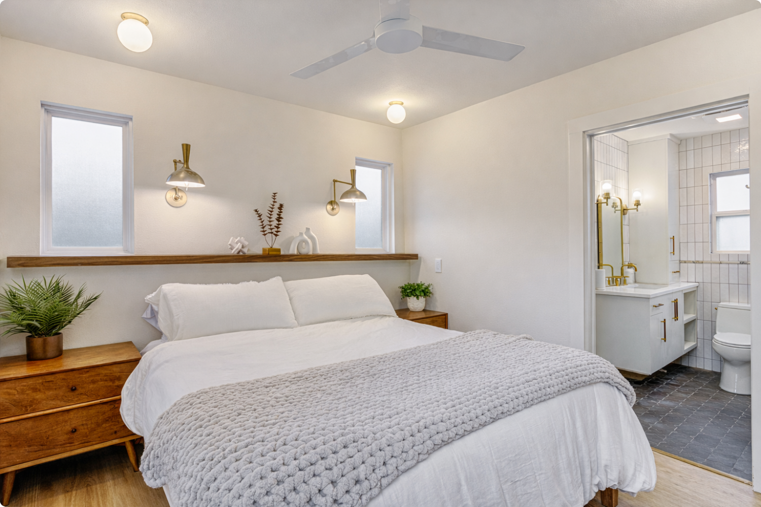 This beautifully renovated, stand-alone home features elegant gold accents throughout and smoothly dimmable lighting in every room, allowing you to set the perfect ambiance—from bright and energizing to warm and relaxing. The space offers a spacious king master bedroom, a full bathroom, a cozy living room, and a fully stocked kitchen. With Sonos speakers throughout the home, your favorite playlists follow you from room to room — creating the perfect soundtrack for your stay.