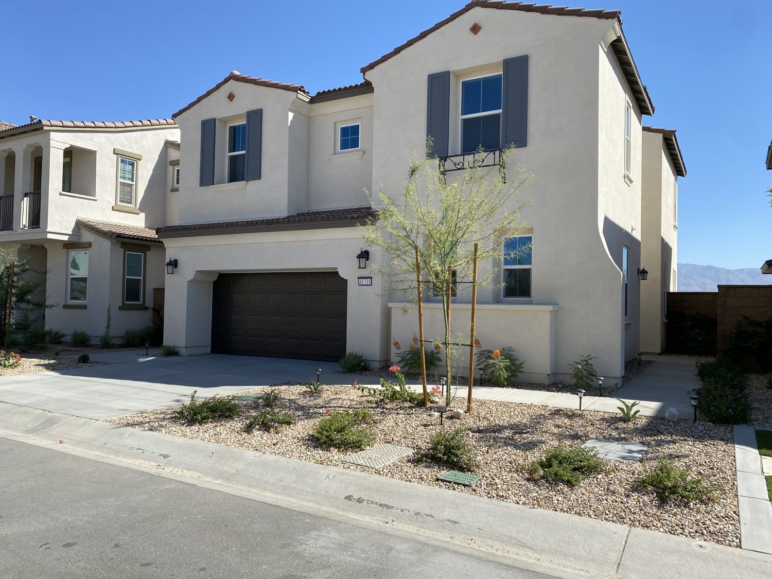 New home (2023) with Beautiful Mountain views! 4 bedroom/3 bath fully furnished single family house in the coveted University Park neighborhood of Palm Desert. One bedroom used as an office and one with a small Pelaton home gym-treadmill and bike.