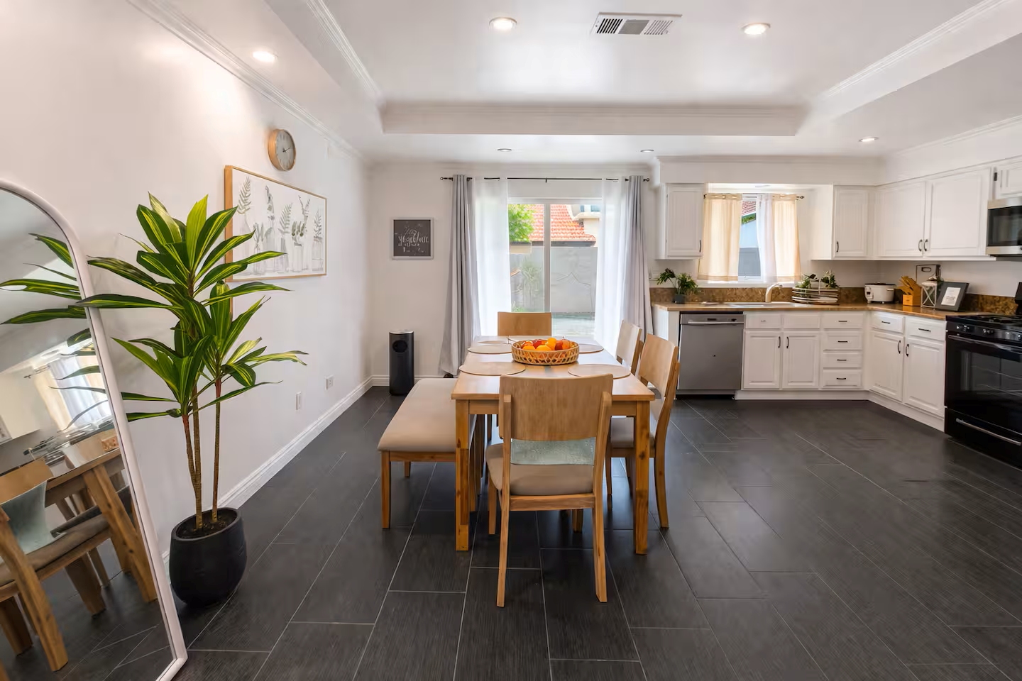 The fully equipped kitchen features granite countertops and modern appliances, including a stove, oven, microwave, dishwasher, coffee maker, and essential cookware perfect for everyday living or hosting meals. A dedicated dining area and workspace, along with fast Wi-Fi, make this home ideal for families, professionals, or anyone needing extra space.