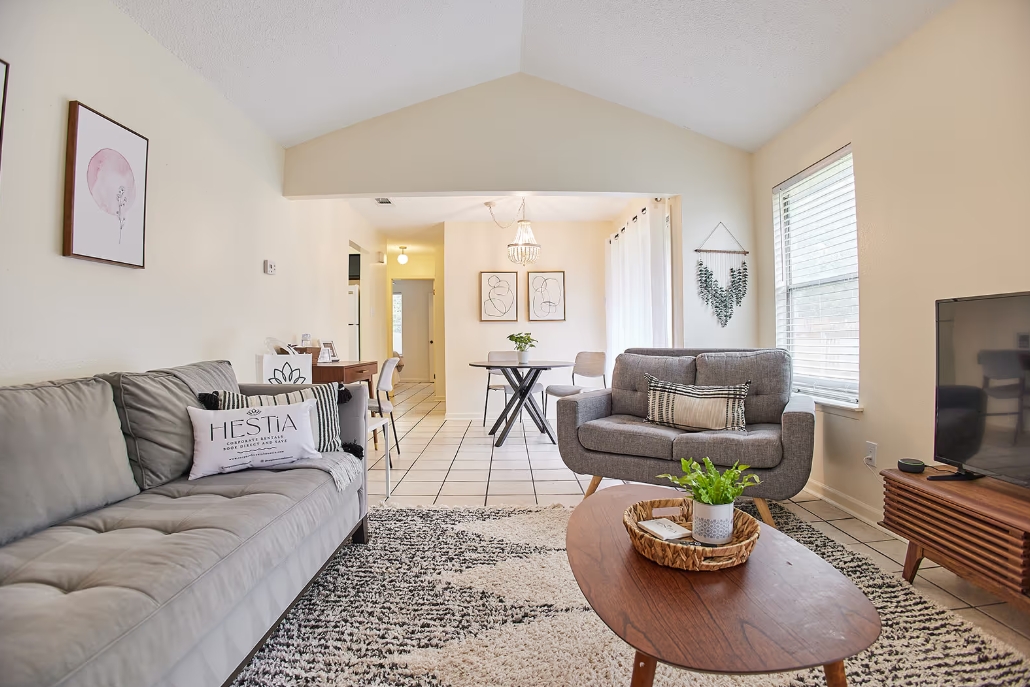 Charming Home in Austin – Perfect for Extended Stays & Getaways 2-bedroom, 1-bath home with comfortable queen beds and modern furnishings Fully equipped kitchen, washer/dryer, and all the comforts of home for extended stays Pet-friendly (max 2 pets, additional fee applies) Prime location: 10 mins to The Domain, 6 mins to Apple Parmer Lane campus, 14 mins to downtown Austin Walking distance to grocery stores and popular restaurants like Franklin Barbecue, Uchi, and Ramen Tatsu-ya Welcome to your home away from home at our bohemian chic home! This newly renovated property boasts two spacious bedrooms with a shared bathroom. The kitchen is well appointed and has everything you could need. Located just a short distance from the vibrant city of Austin, you will have easy access to some of the best restaurants in the area. Enjoy some of the local favorites such as Franklin Barbecue, Uchi, and Ramen Tatsu-ya. Other area attractions worth checking out include Zilker Park, Lady Bird Lake, and the Texas State Capitol. With everything you need for a comfortable stay, this property is the perfect choice for your next trip to Austin. Book now and experience the best of Texas hospitality! Both bedrooms offer a luxurious queen bed Parking for 2 cars (1 in garage, 1 in driveway) Location: 10 mins to Domain 10 mins to Apple Parmer Ln campus 14 mins to Downtown 20 mins to Austin Bergstrom Airport Schools: Kathy Caraway Elementary School, Distance: 0.9 mi Middle: Canyon Vista Middle School, Distance: 1 mi High School: Westwood High School, Distance: 2.5 mi Here's what sets us apart: Hassle-Free Booking: Enjoy the ease of Instant Book and self-check-in with a personalized door code Every guest receives a custom lock that expires at check out, ensures security and privacy. Pet-Friendly with Peace of Mind: All our homes feature fully fenced yards, so your furry friends are welcome to join your stay. Max 2. More? pls inquire Exceptional Cleanliness: Sleep soundly knowing that duvet covers are freshly washed between every stay. Easy Parking & Laundry: Each property offers convenient parking Tailored for Extended Stays: We offer flexible leases and specialize in accommodating long-term guests. Work & Relax with Ease: Dedicated workspaces in every home make it easy to balance productivity and leisure. ~HIGH SPEED INTERNET In-home laundry