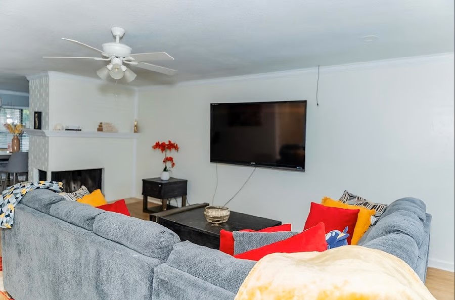 Fresh paint, custom window blinds, and new lighting in every room including closets fill the home with warmth and brightness. An electric fireplace adds a cozy touch to the living space, making it the perfect spot to gather and relax.