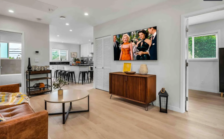 Soak in the California lifestyle of indoor/outdoor living in this open floor plan home boasting large front and backyard with firepit, outdoor dining and giant swing chair baskets. Our living space is filled with post modern designer furniture, SmartTVs and all brand new memory foam beds.