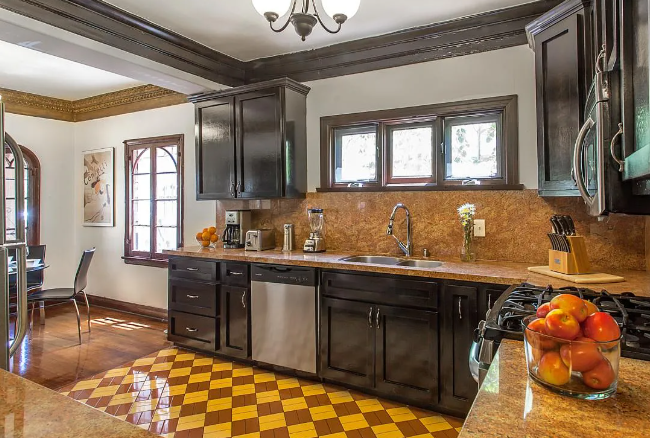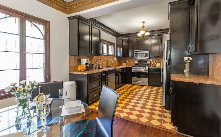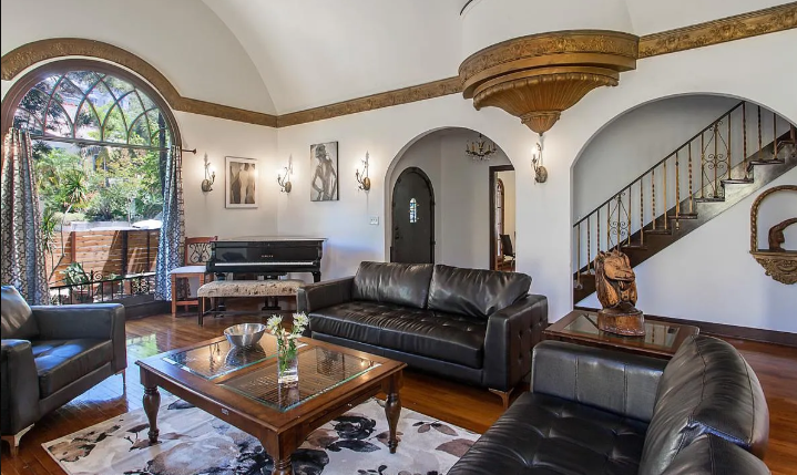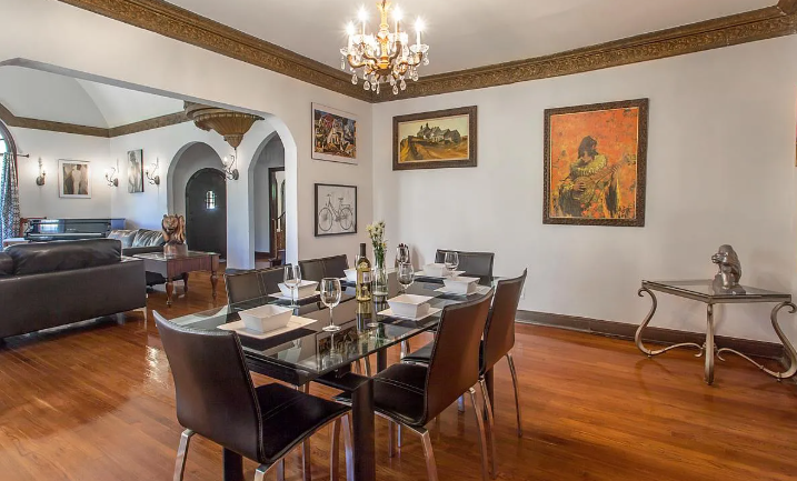 This spacious fully-furnished home is located in the hip Silver Lake area. The single family home has 4 spacious bedrooms, 3.5 bathrooms, a spacious kitchen, and an entertaining living room with a grand piano. The dark natural wood flooring, dark kitchen cabinets, and leather seats give the home an old Hollywood feel.