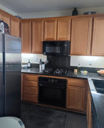 - Modern kitchen featuring granite countertops, built-in microwave, range oven, and dishwasher.