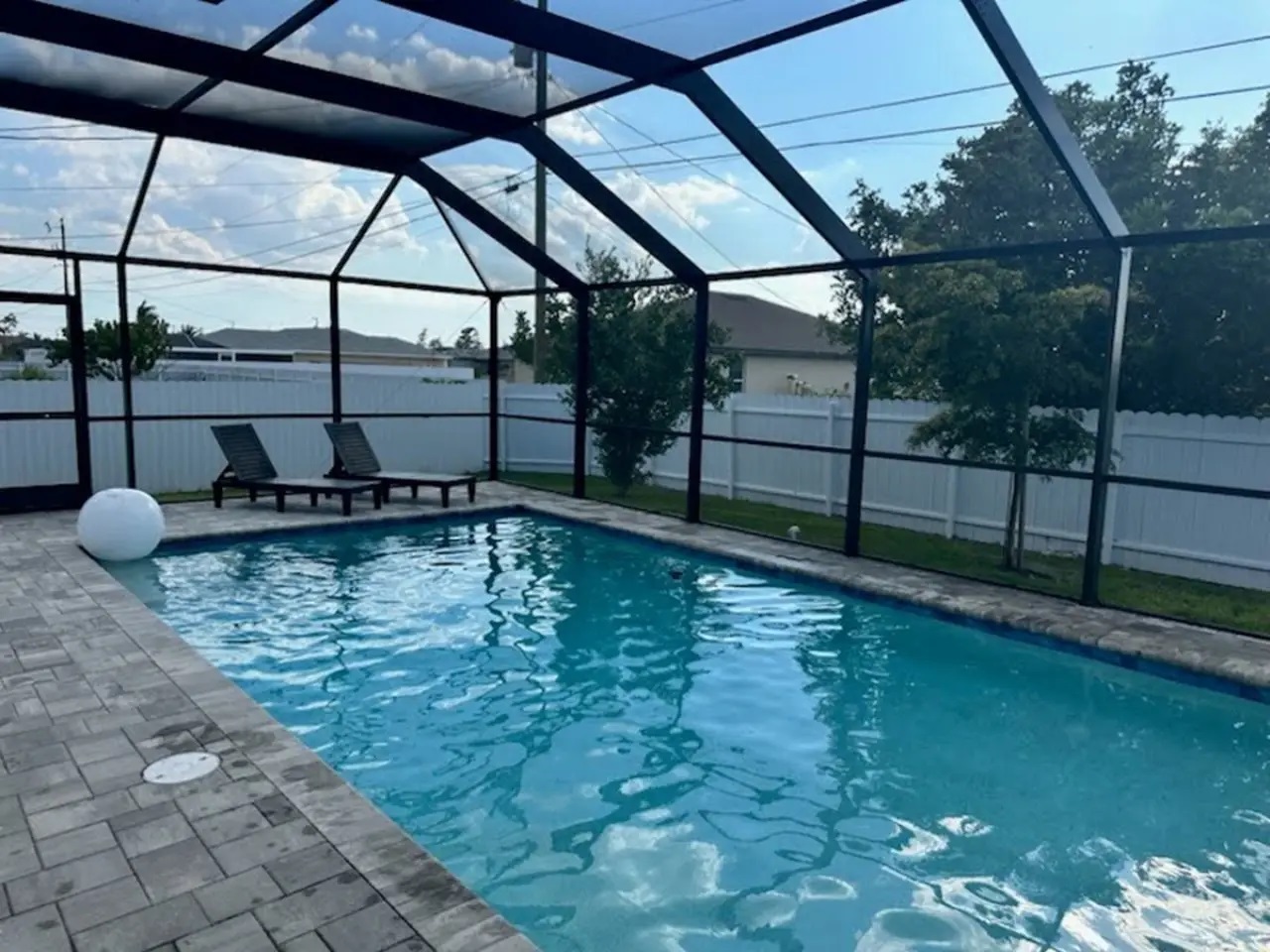 Beautiful spacious 4-bedroom, 3-bath home in Cape Coral. Spacious living room and dining area featuring vaulted ceilings. 2 walks in showers. Enjoy your evenings in covered lanai patio with BBQ grill. Heated pool. Attached two-car garage with charging station hook up for your electric vehicle.Completely Fenced in.