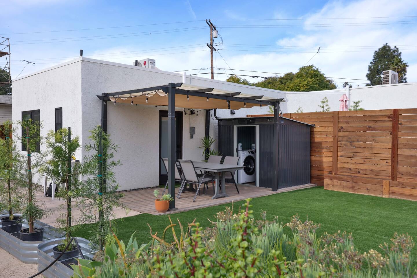 • Private backyard with grassy area + outdoor dining under a pergola