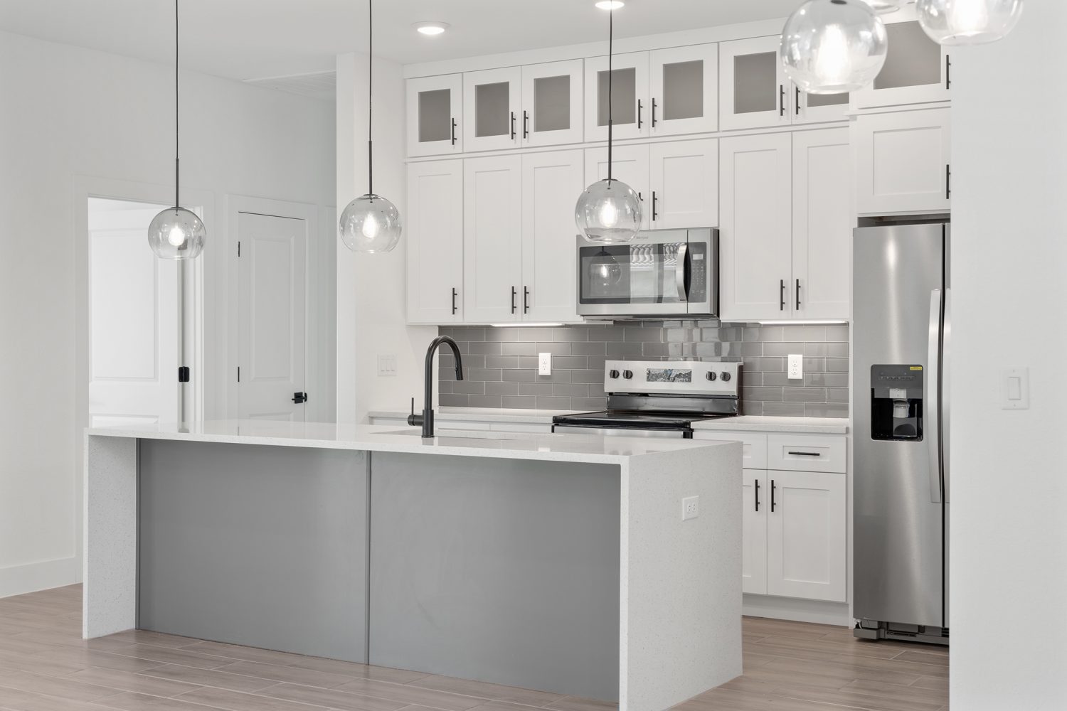 From the moment you arrive, the bold exterior styling, clean architectural lines, and fresh landscaping create an immediate impression. Inside, you'll find a bright, open-concept layout perfect for both entertaining and comfortable living. At the heart of the home, the custom kitchen is a showstopper, featuring ceiling-height cabinetry, a sleek waterfall island, and high-end finishes that elevate the space. The adjacent dining and living areas flow effortlessly, making it easy to host or relax with family. Retreat to the private master suite, complete with a spacious walk-in closet and a spa-inspired bathroom with dual vanities and a large walk-in shower.