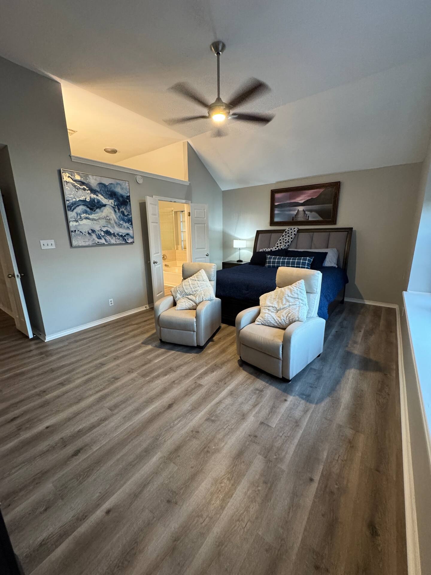 Master bedroom has a King size bed and sitting loveseat with a televisionin it. Rustic bedroom has a queen size bed . Twin room has two twin beds and bedroom downstairs has a full size bed.