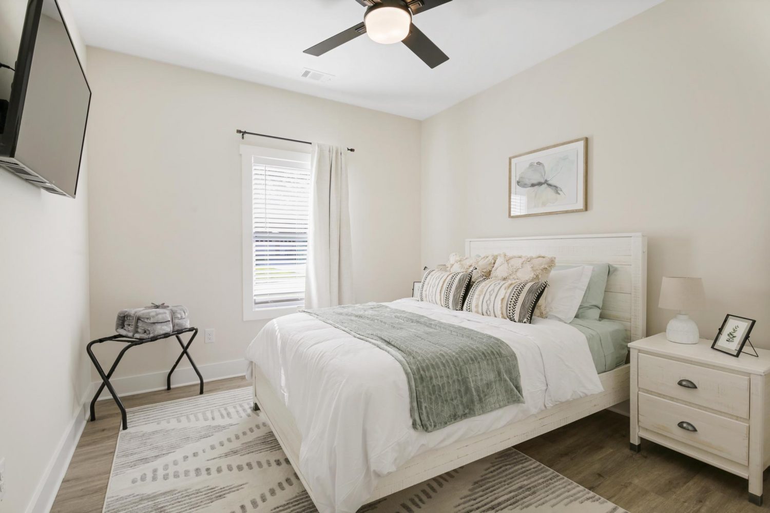 - Ceiling fan, blackout curtains, & ample storage