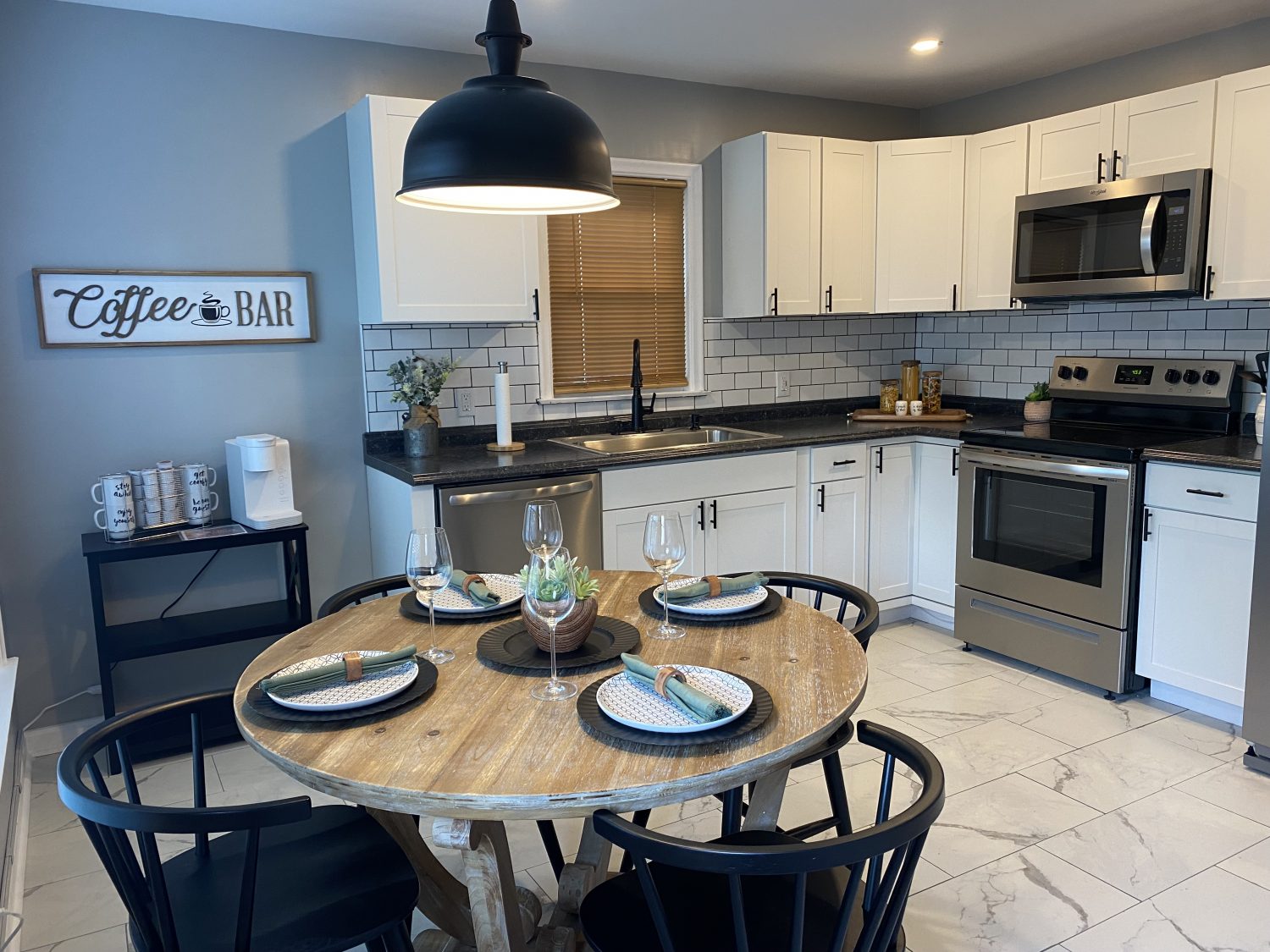 The living room includes plenty of comfortable seating, and a 50" smart TV. The kitchen is equipped with new appliances including Keurig coffeemaker, dishwasher and fully stocked with cookware. Beautiful hardwood flooring and tile throughout. There is no carpet. The bedrooms have queen size medium firmness memory foam mattresses with plenty of closet, storage space and room darkening curtains. Washer & dryer in the unfinished basement along with plenty of storage and a half bath. There is a large front porch for sitting and relaxing and a patio in the private backyard. There is also a 2-3 car garage for your use as well.