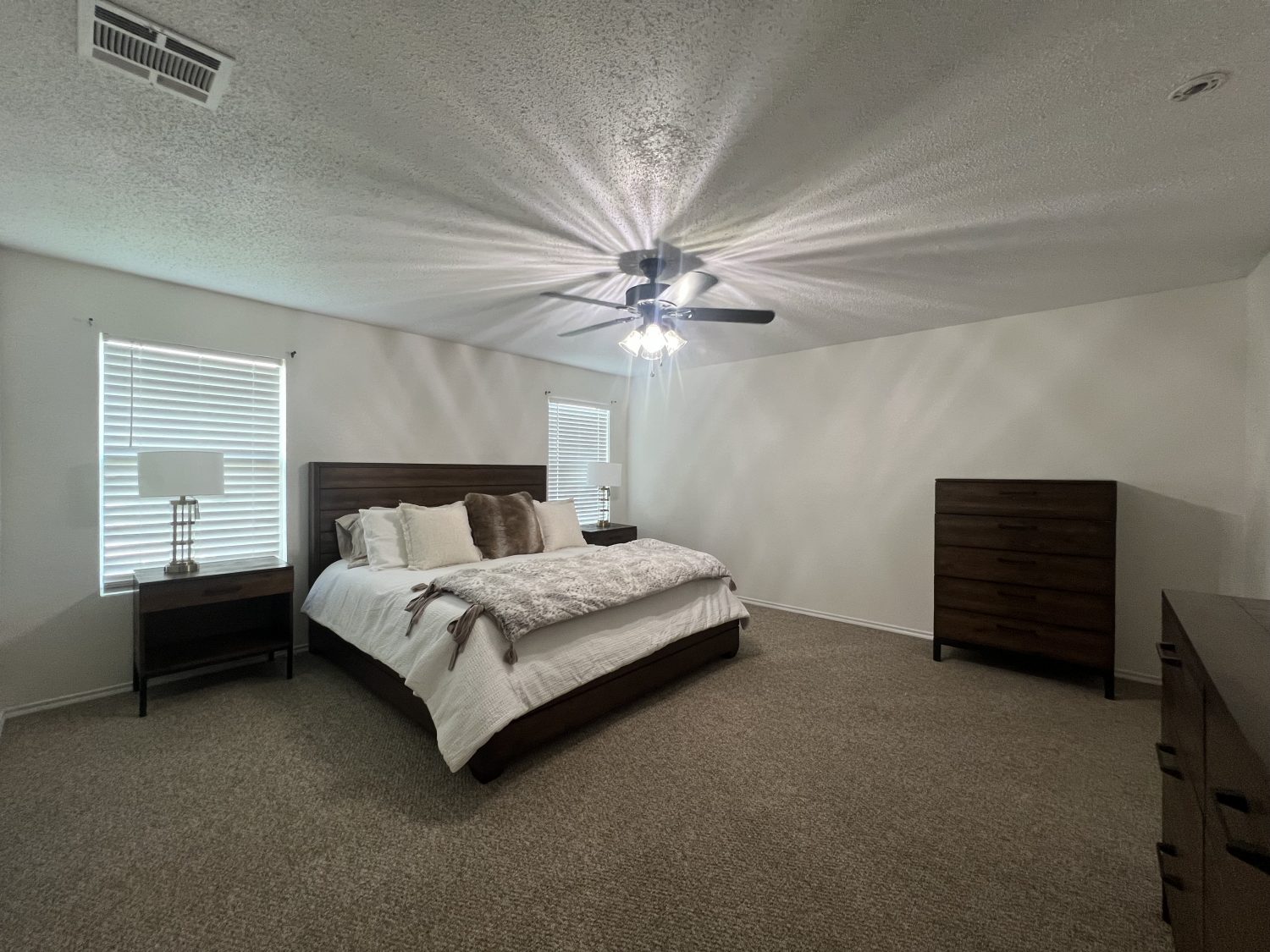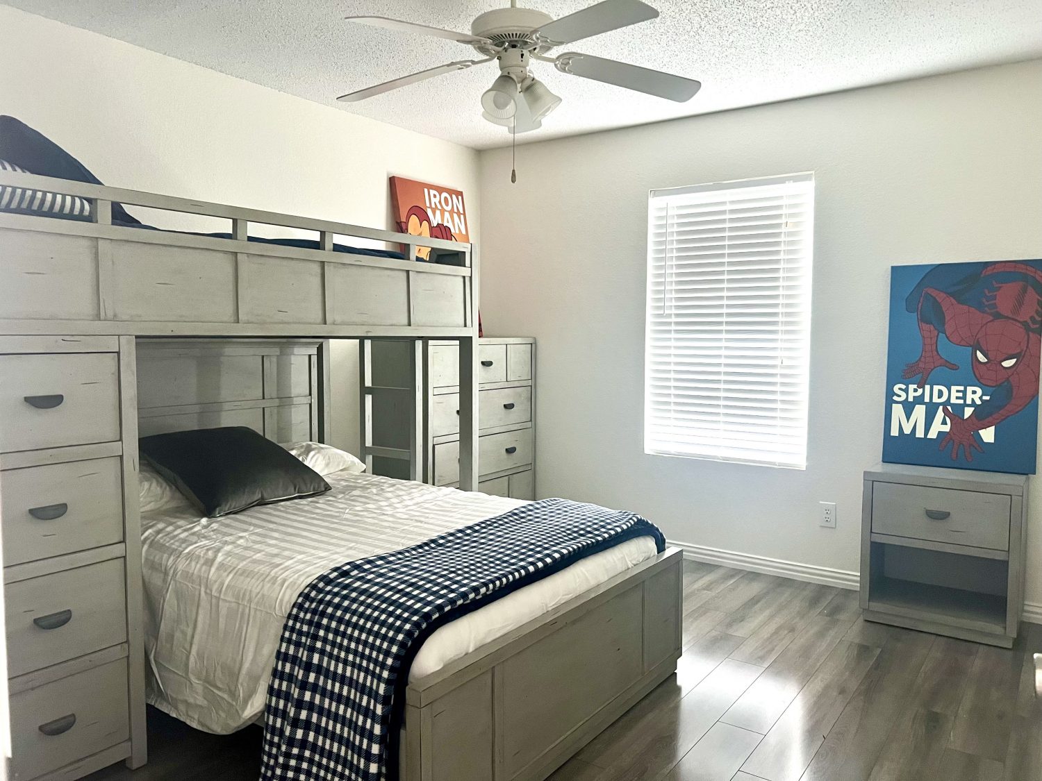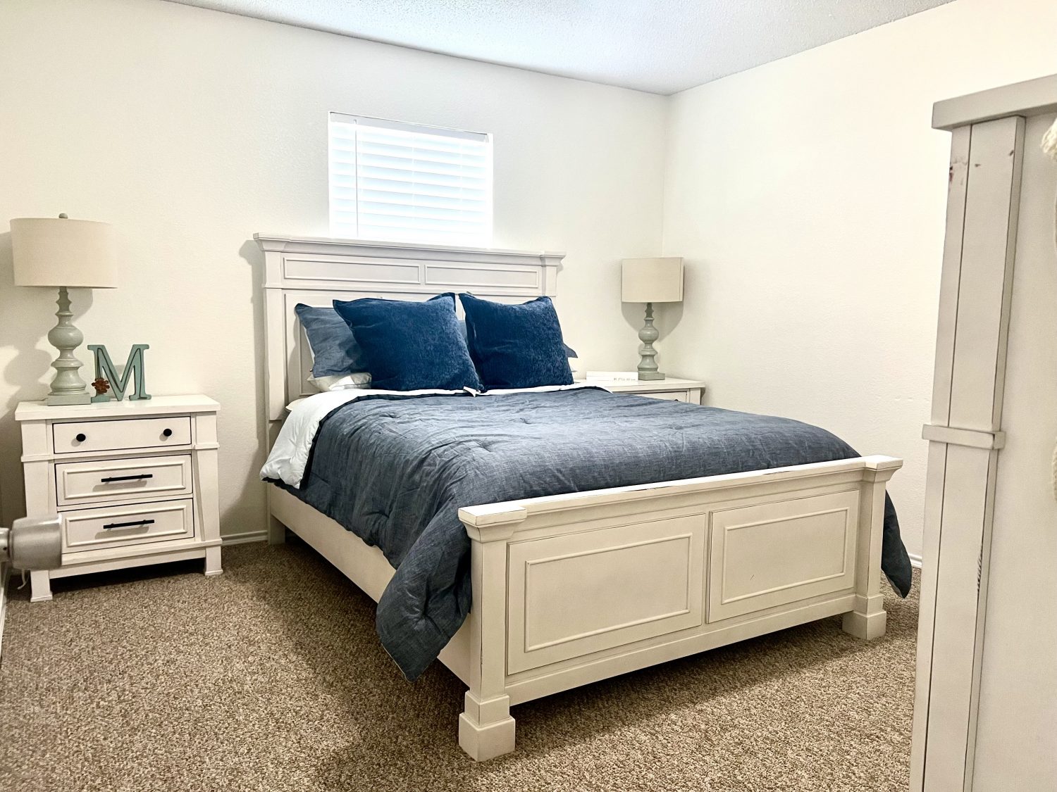 This comfortable two-story home with a thoughtful layout designed for everyday ease. Downstairs, the open floor plan blends a relaxed living room setup, complete with a sofa, coffee table, and end table, with a dining room and kitchen ready for action. The kitchen includes everything you need, from a full-size fridge and electric range to a coffee maker, toaster, and microwave. A breakfast bar adds extra seating, perfect for quick bites or catching up with friends.