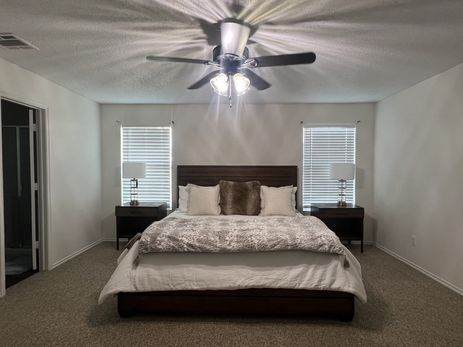 Upstairs, the primary bedroom has an ensuite bath with dual sinks, a soaking tub, and a separate shower. Two additional bedrooms also feature walk-in closets, each outfitted with nightstand lamps, giving them a warm and cozy feel. Flooring throughout the home is a mix of tile, carpet, and vinyl plank, combining comfort with easy maintenance. A separate laundry room with washer and dryer hookups is located on the main level for added convenience.
