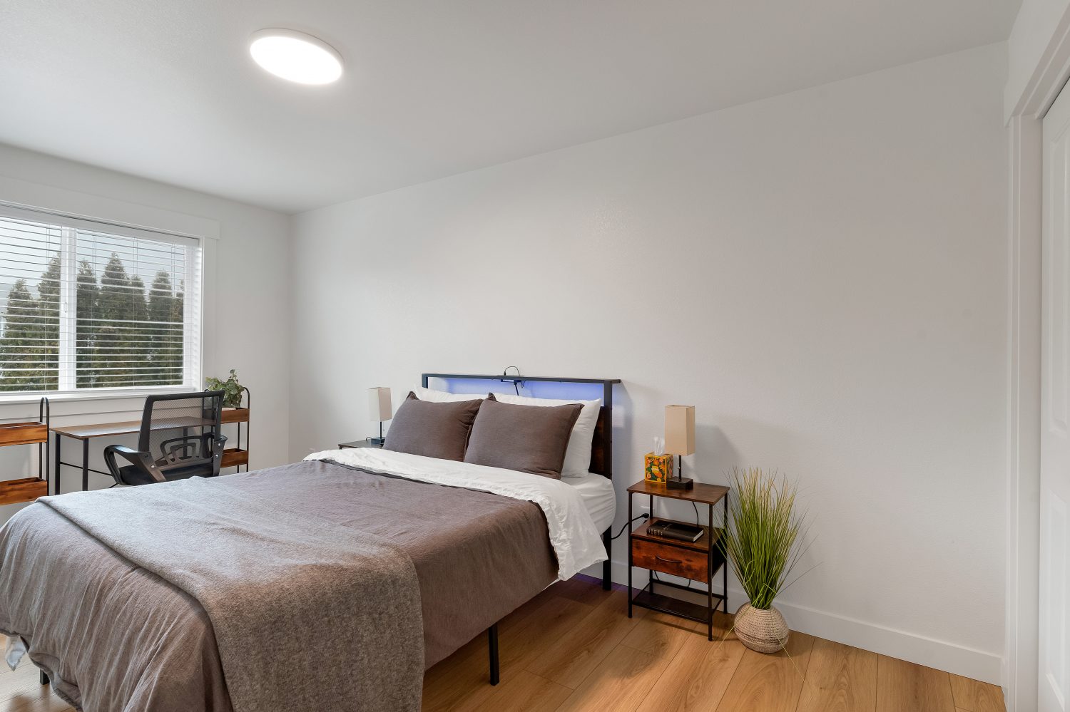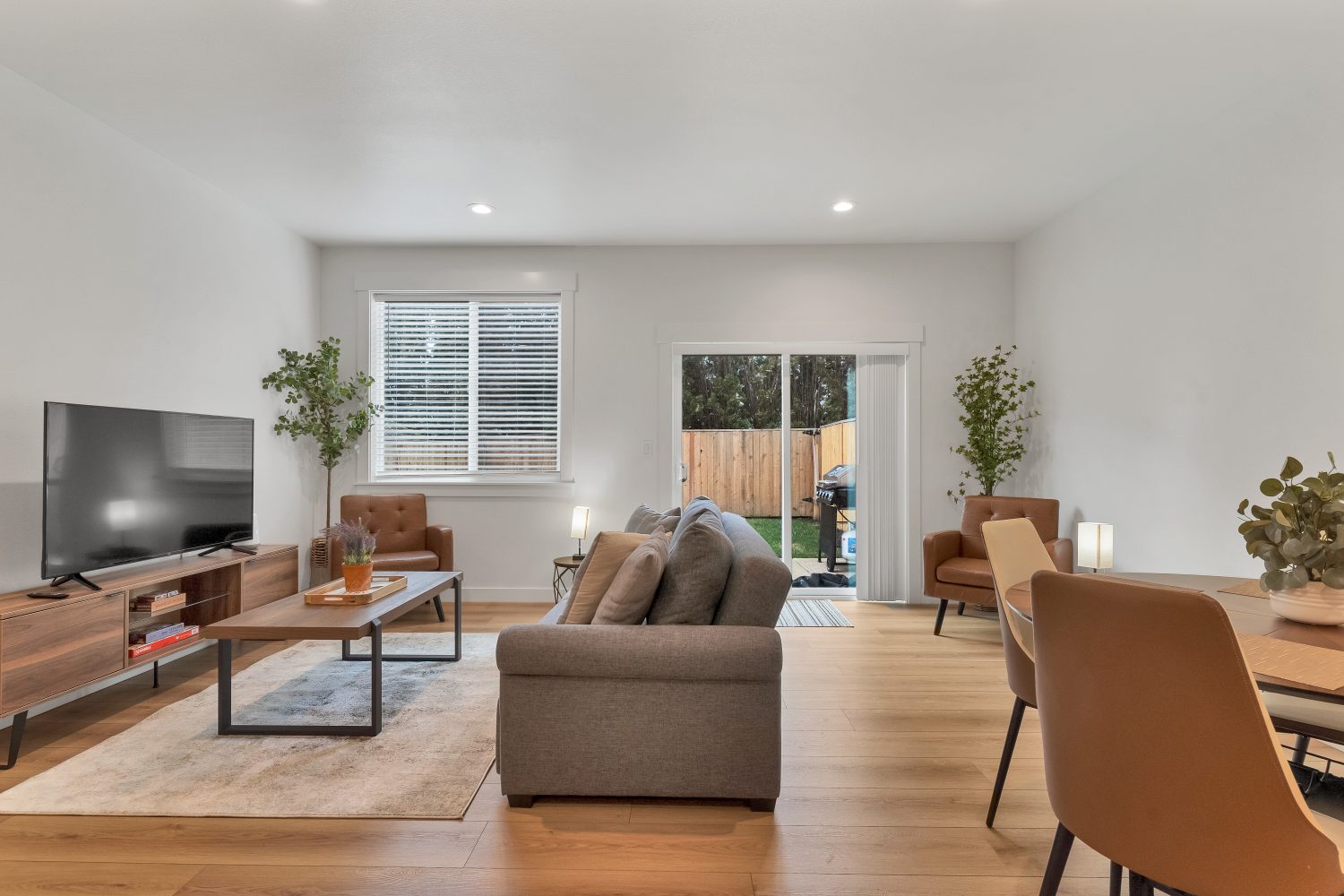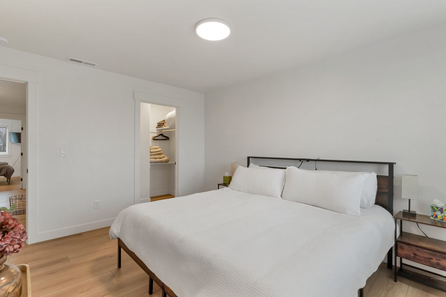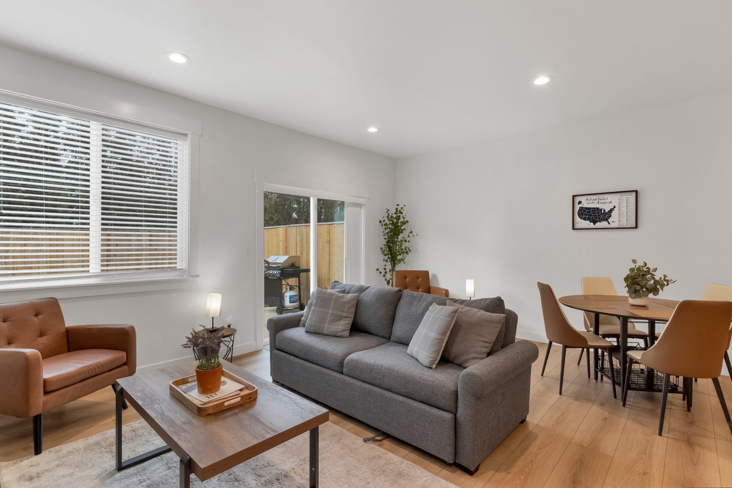 Minutes to downtown, beautiful Willamette River and coffeeshops/restaurants! Upstairs features three spacious bedrooms: a primary with a king bed and two with queen beds. There are also 2 full bathrooms upstair. A washer and dryer is also included upstairs for your convenience. Downstairs offers a powder bathroom, bright living area with a queen pullout sofa and a fully stocked kitchen. Step outside to a spacious fenced yard with a patio, seating, and a barbecue grill. The home also includes a one-car garage and driveway parking.