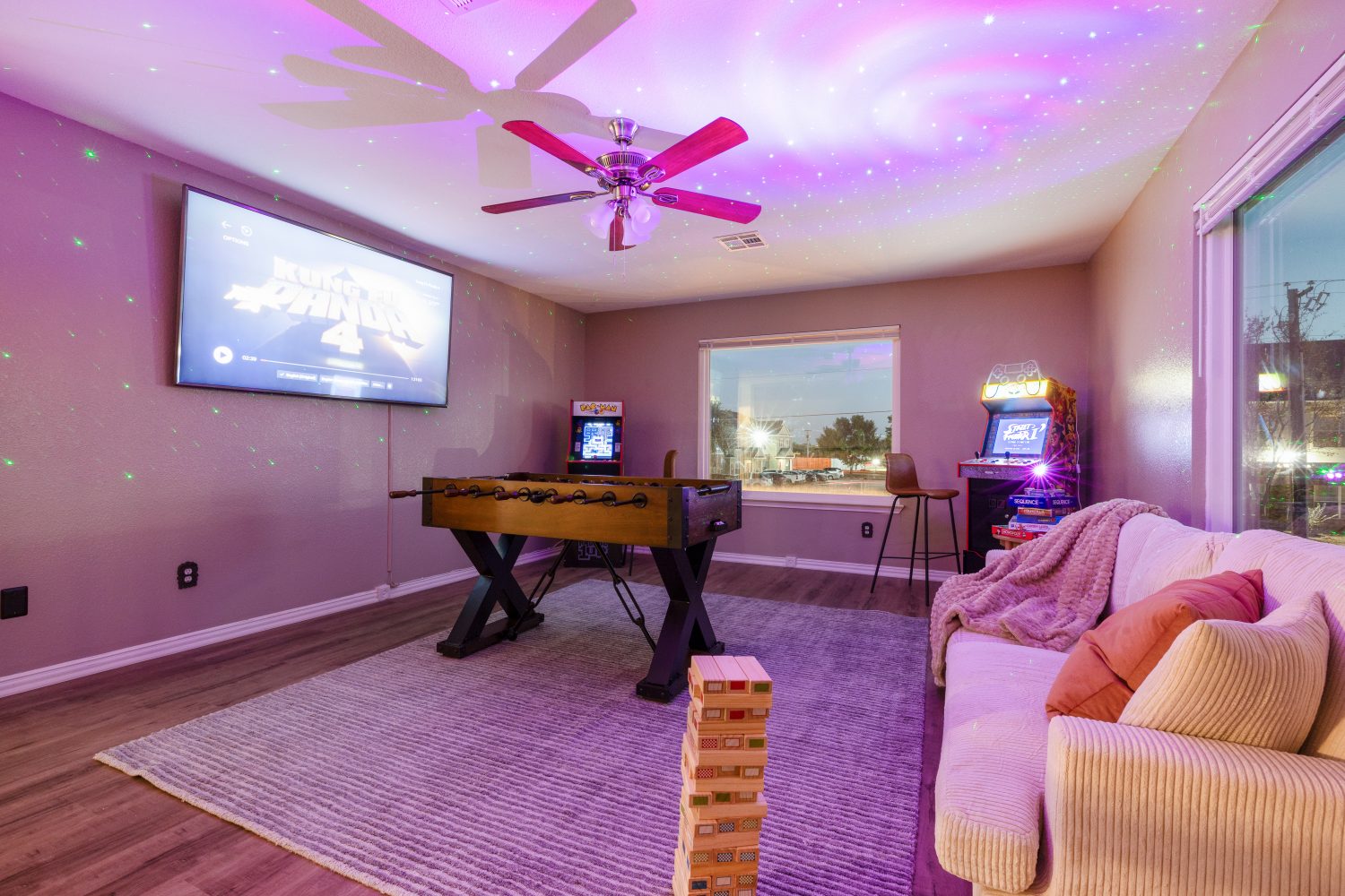 Welcome to your family-friendly Texas getaway! This spacious 5-bedroom, 3-bath home offers endless fun, boasting a big backyard complete with a cowboy pool, volleyball net, disc golf, and a blow-up screen theater for cozy outdoor movie nights. Indoors, guests will enjoy a variety of entertainment options, including a poker table, foosball table, and arcade games—perfect for all ages. Fully equipped kitchen.