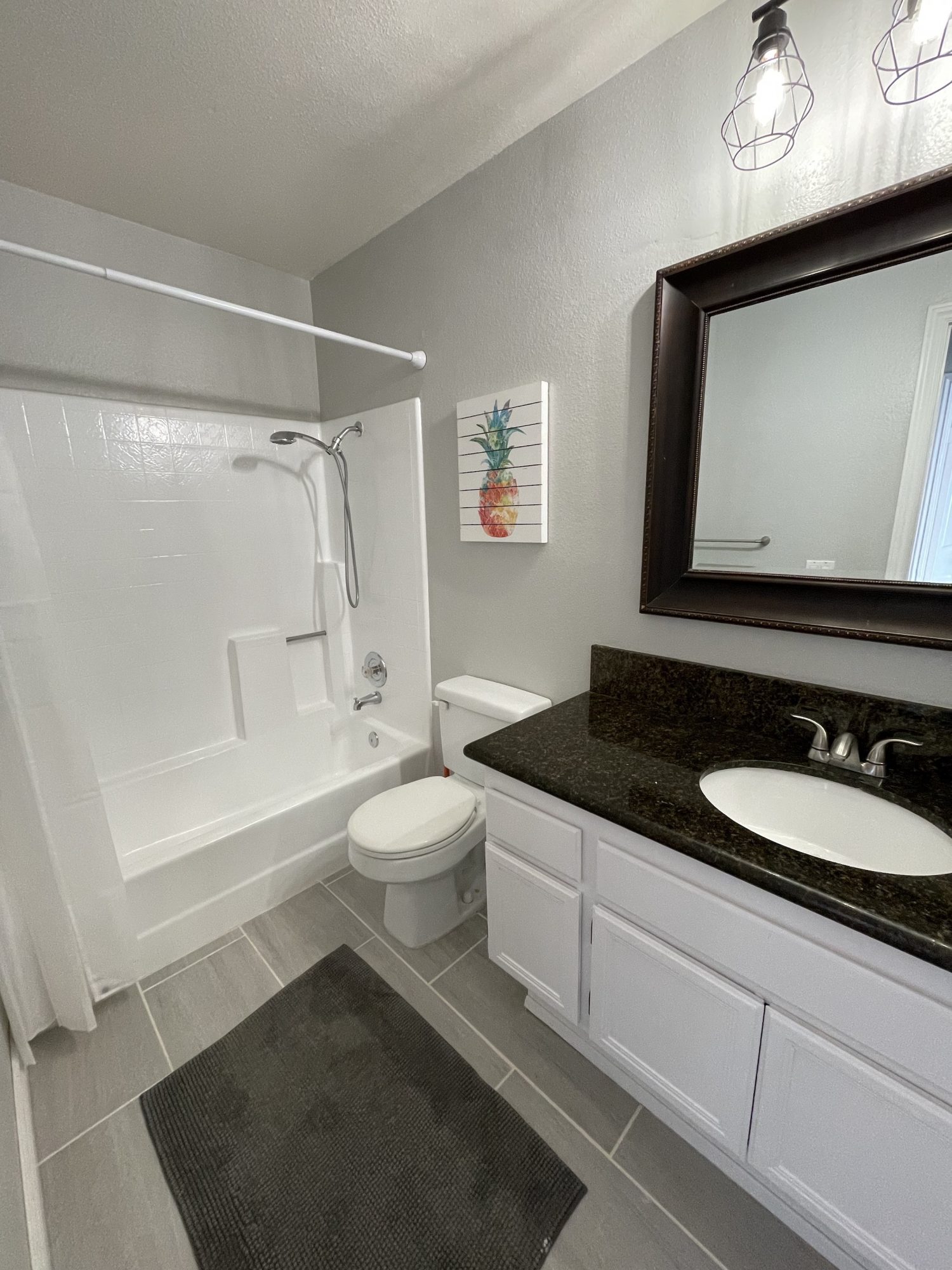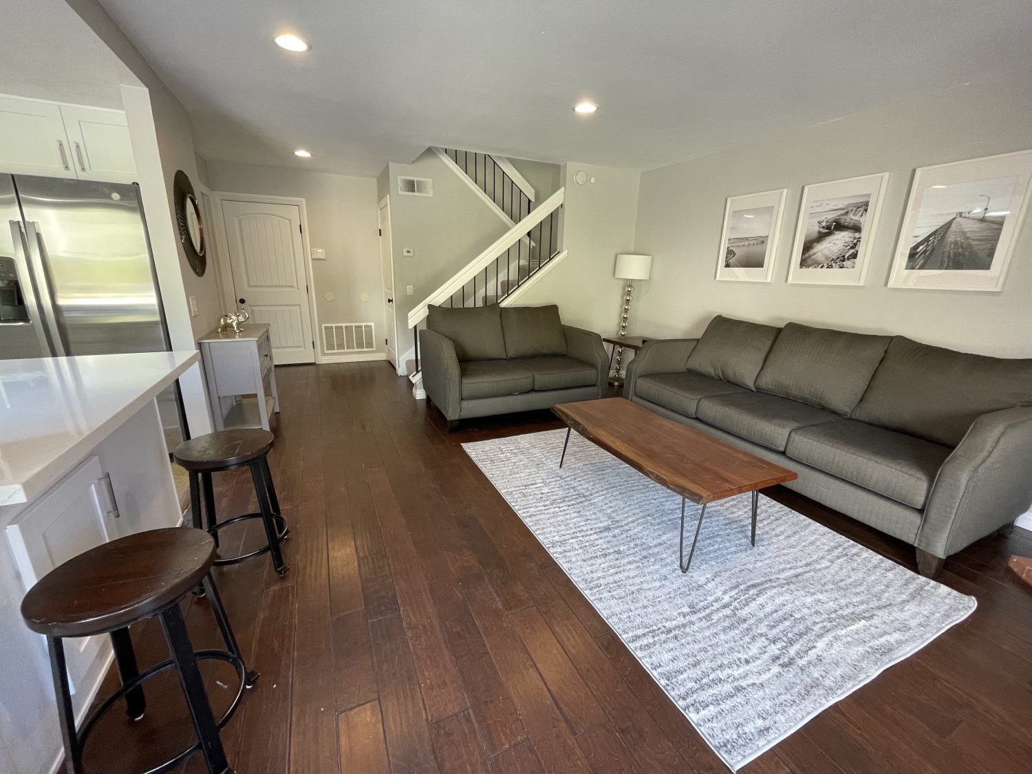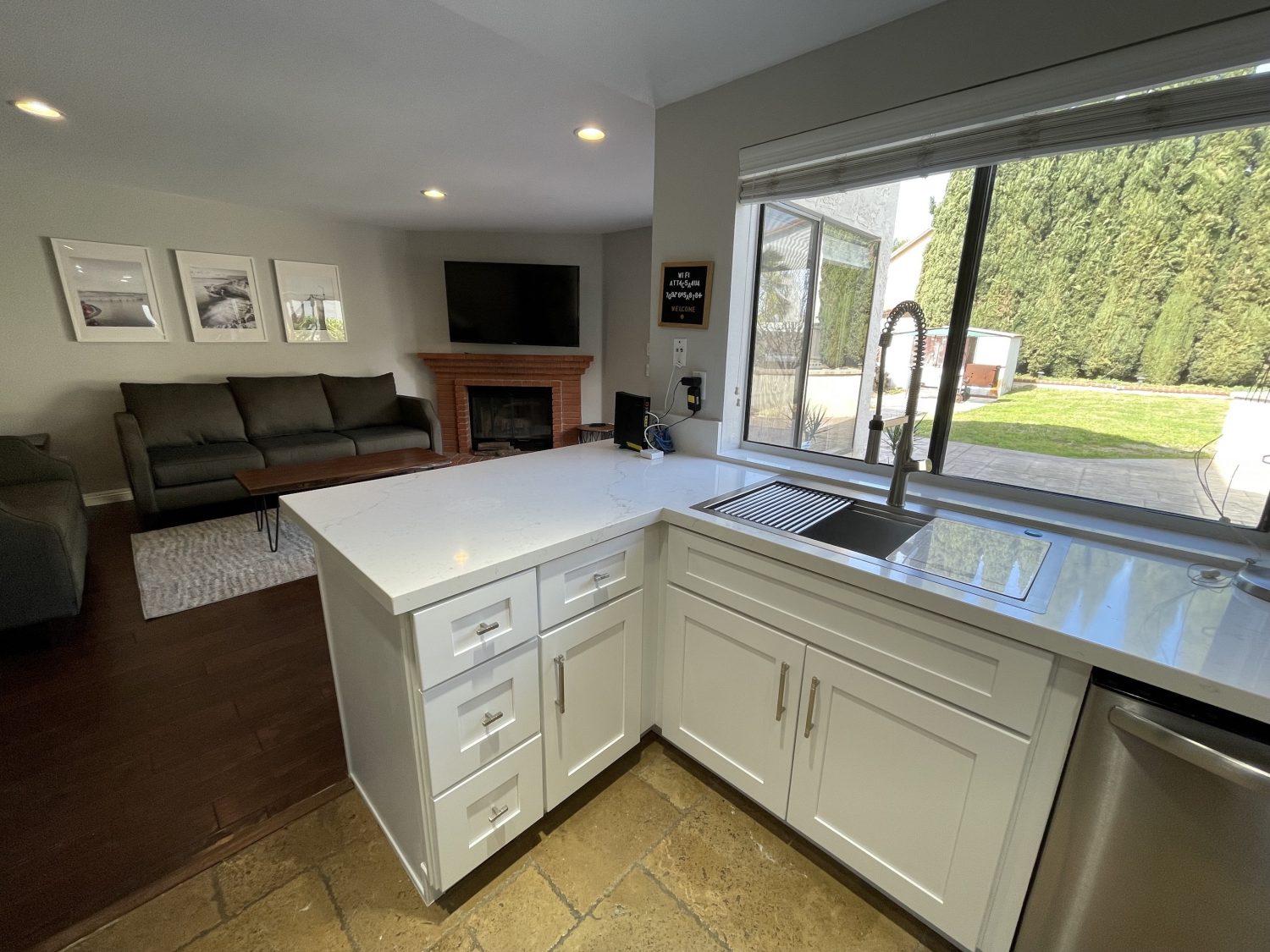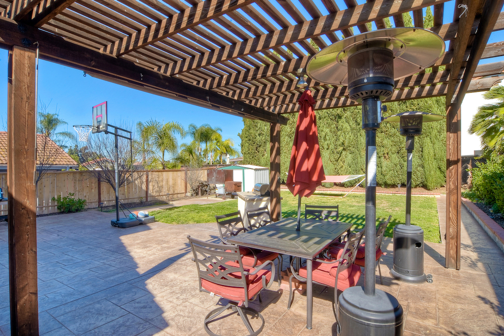 Updated 3 bed 2 1/2 bath fully furnished home with 2 living rooms, and 2 bbq's. The home boasts a new kitchen, newer paint throughout, new roof, new canned lights in living room, newer interior doors throughout, open floor plan with two living rooms and tons of natural light and now has central A/C. Large oversized backyard with tree lined fence, stamped and colored concrete with a pergola with power. The kitchen has quartz counter tops, stainless steel appliances, laminate and tile flooring throughout downstairs, epoxy garage floor and a large primary bedroom with double doors. The home has a king in the primary bedroom, and queens in the second and third bedroom. It also has a washer and dryer along with all linens and a full stocked kitchen.