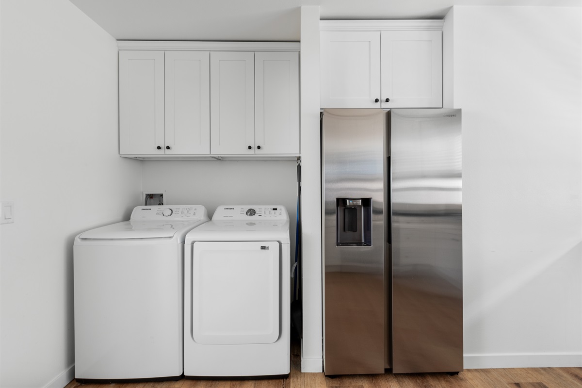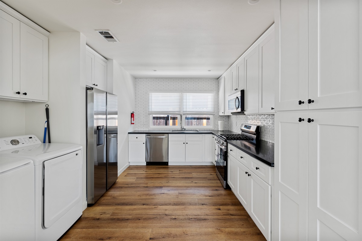 Kitchen & Laundry: Fully equipped kitchen with full-size appliances, plus in-unit washer and dryer