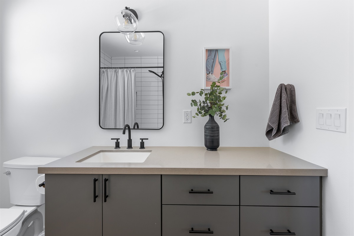 2. Secondary Bedroom: Queen bed and dedicated workspace; shares a hallway bathroom
