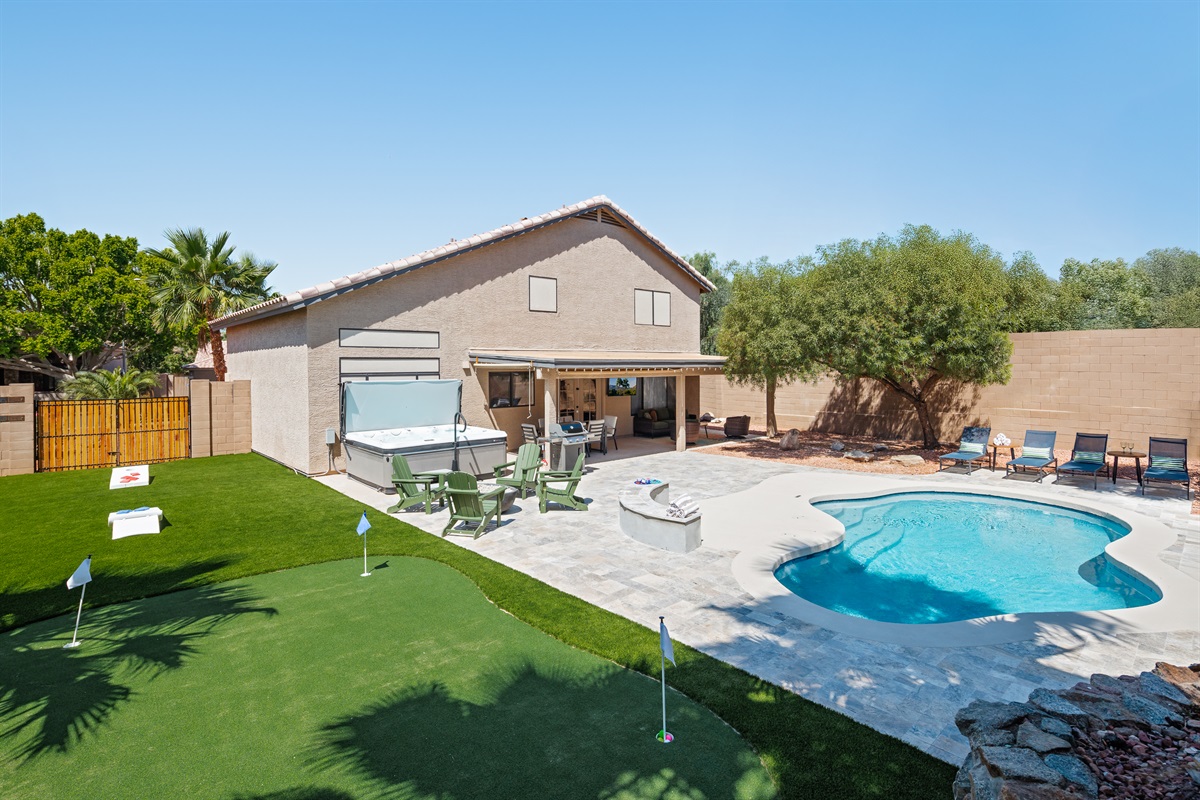 his is truly a Scarlett Canyon Retreat complete with private heated pool, salt water HotTub, gas BBQ, gas fire table +fire pit, putting green, dining, loungers, yard games and turf for pets and kids. Centrally located yet in a private, peaceful, quiet location.