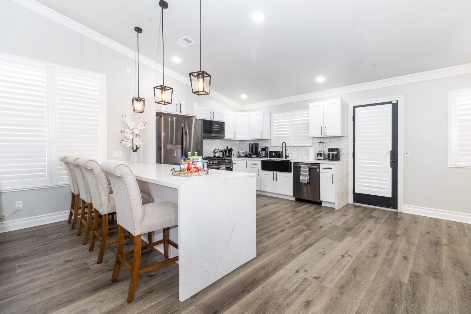 Modern Kitchen: Stainless steel appliances, 5-burner stove with griddle, marble countertops, bartop seating, beverage refrigerator, and dual wine fridges. Fully stocked with essentials for everyday cooking and dining.