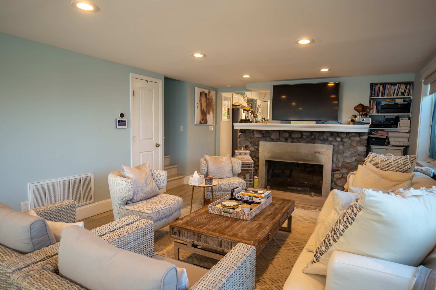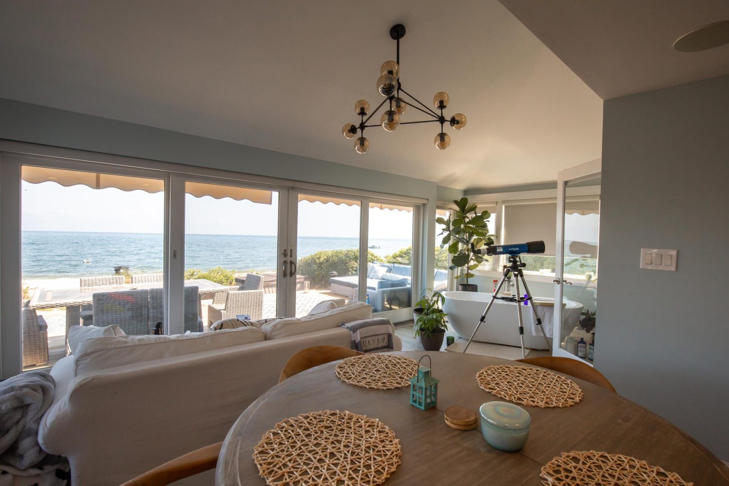 The main living level includes an open kitchen, dining area, and living room oriented toward the Sound, along with a fireplace and TV. Multiple seating areas allow guests to spread out comfortably throughout the home.