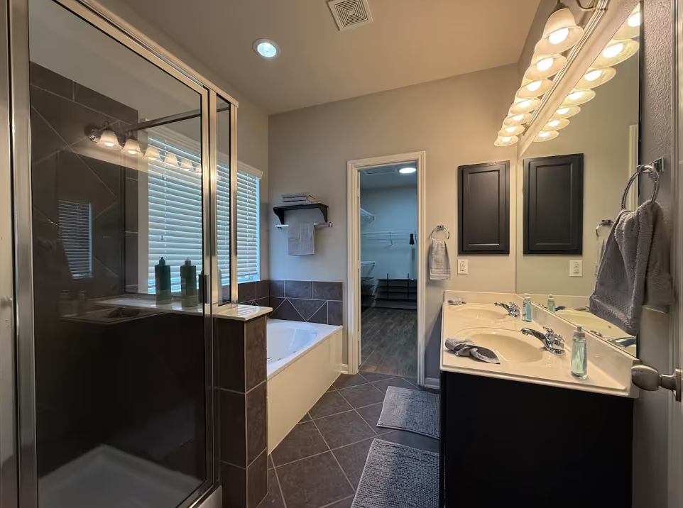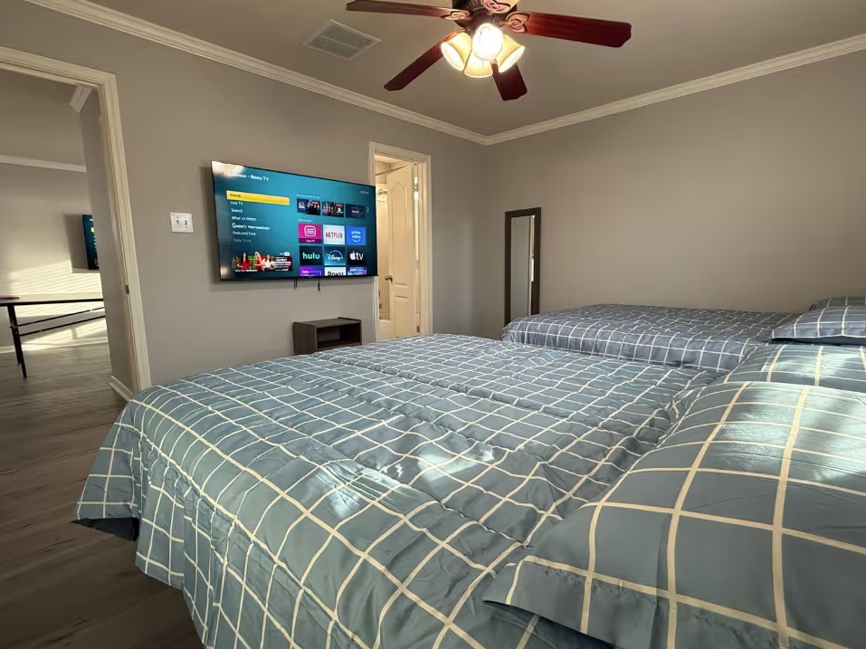 Spacious 5-Bedroom Home with Entertainment and Comfort This beautifully designed home is perfect for families or groups, offering 5 bedrooms and plenty of space to relax. Four bedrooms feature two queen beds each, while the fifth boasts a luxurious king bed. All bedrooms are equipped with TVs for your convenience. This 5-bedroom, 3.5-bathroom home sleeps up to 18 guests with 9 cozy beds. The master bedroom on the main floor with en-suite bathroom, plus TVs in every room ensure comfort for all. Enjoy the pool table and ping pong table in the game area or relax in the large, spacious yard. The open living space is perfect for gatherings, and the fully equipped kitchen makes meal prep a breeze. Whether relaxing or exploring, this home is your perfect getaway! Key Features: • Master Suite Downstairs: Enjoy privacy with 2 queen beds, an en-suite bathroom, and direct access to the main living areas. • Connected Bathrooms Upstairs: Three upstairs bedrooms are thoughtfully connected to shared bathrooms for added comfort. • Entertainment for All: Challenge your group to a game of ping pong or pool in the game area. • Large Yard: Perfect for outdoor activities, relaxation, or just enjoying the fresh air. The open living spaces and thoughtfully designed layout make this home ideal for creating lasting memories. Book your stay today!