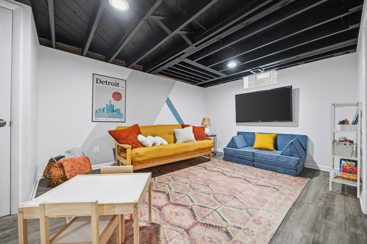Downstairs, a spacious finished basement offers a work area, kids’ play area with games, a futon, laundry room with two sets of washer and dryers, a fourth bedroom with a queen bed, and an additional full bathroom. Traveling with young children? We’ve got you covered with a high chair and pack-and-play onsite.