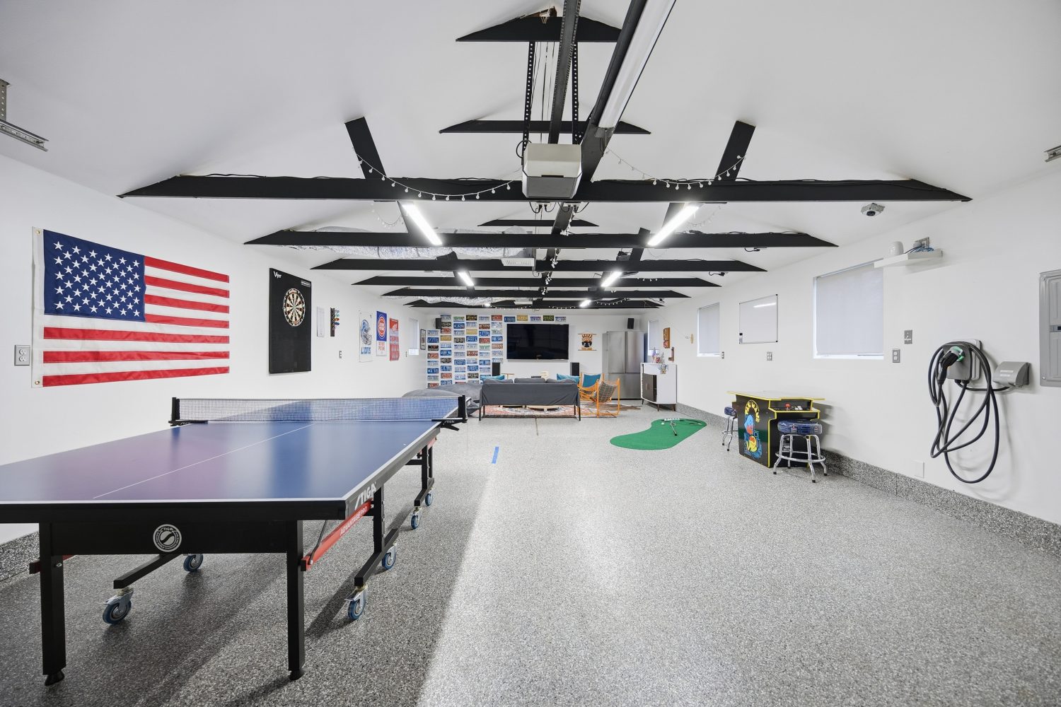 Step outside to a fully fenced yard, perfect for pets and children to play safely. The large heated garage has been transformed into the ultimate game space, featuring a mini bar, full-size refrigerator/freezer, comfy sitting area with oversized floor pillows, television, Pac-Man, darts, ping pong, Jenga, putting mat, plus an extra table and chairs you can set up for additional seating and more! Bright 5,000-lumen shop lights illuminate the space, and an EV car charger adds convenience. Ample driveway and street parking make arrivals and group stays effortless.
