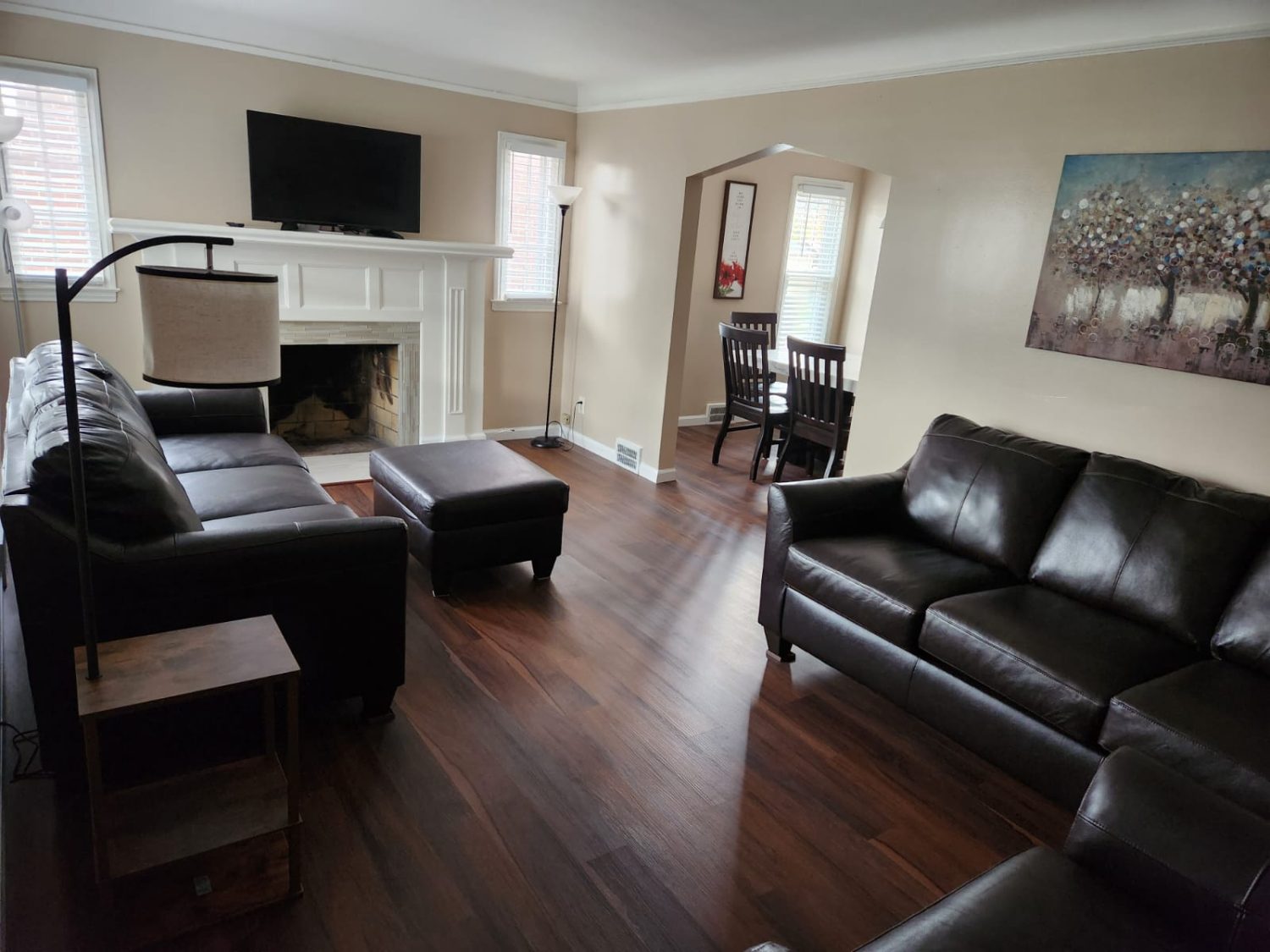 This spacious and modern 4-bedroom, 2.5-bathroom home is a perfect temporary residence for homeowners who need to relocate due to damage or renovation. The home has everything you need for a comfortable stay, including a fully equipped kitchen, central air conditioning, laundry facilities, Wi-Fi, and Fire TVs. You can also feel safe and secure with the Vivint home security system and keyless entry. The location is convenient for commuting, as it is close to two major highways (M-39/M-10) and only 14 minutes away from downtown. The home can fit up to 8 guests and is available for monthly rental.