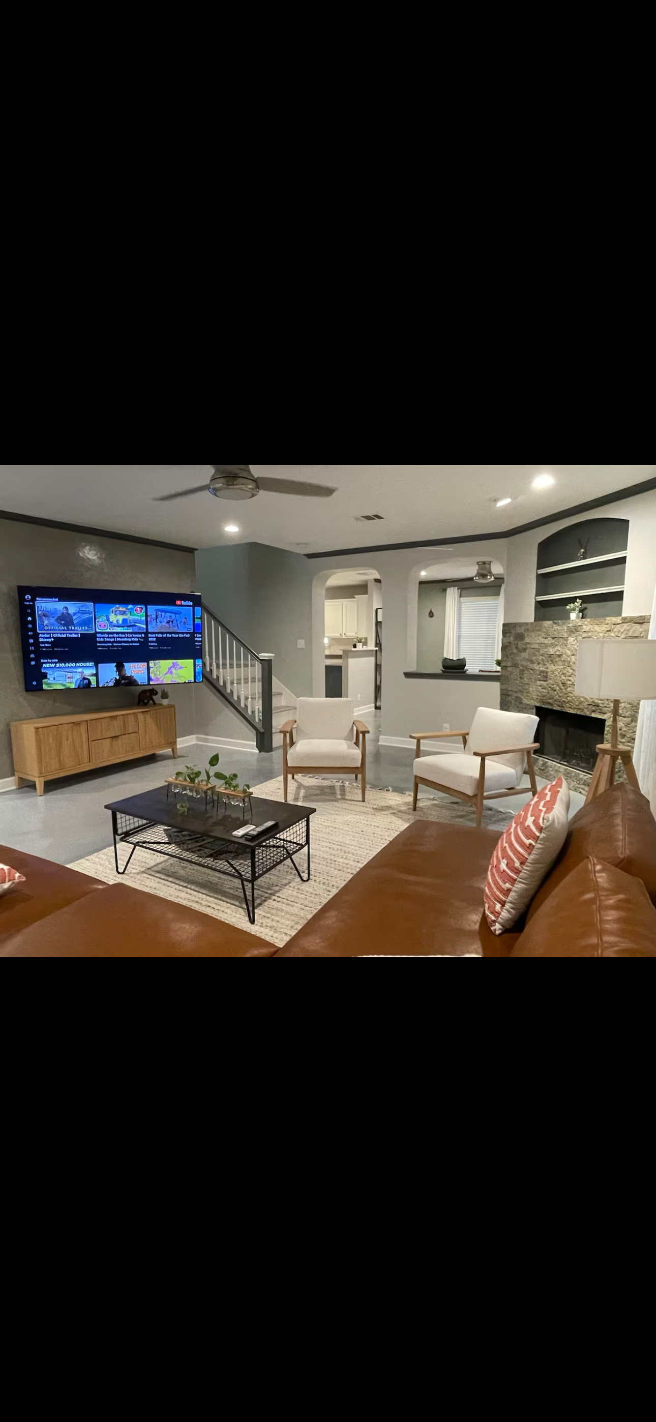 75" smart tv downstairs and a modern comfortable west elm sectional.