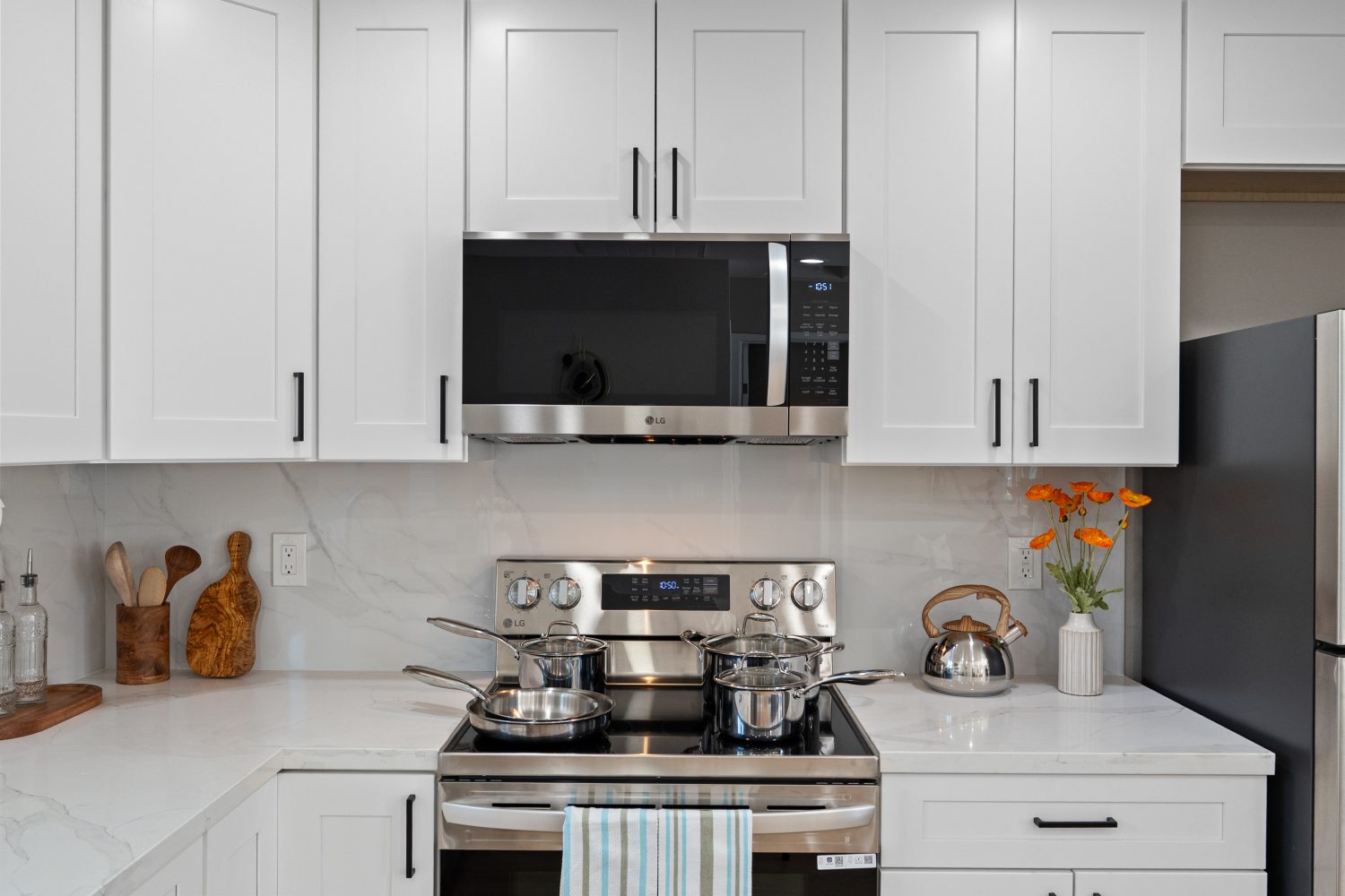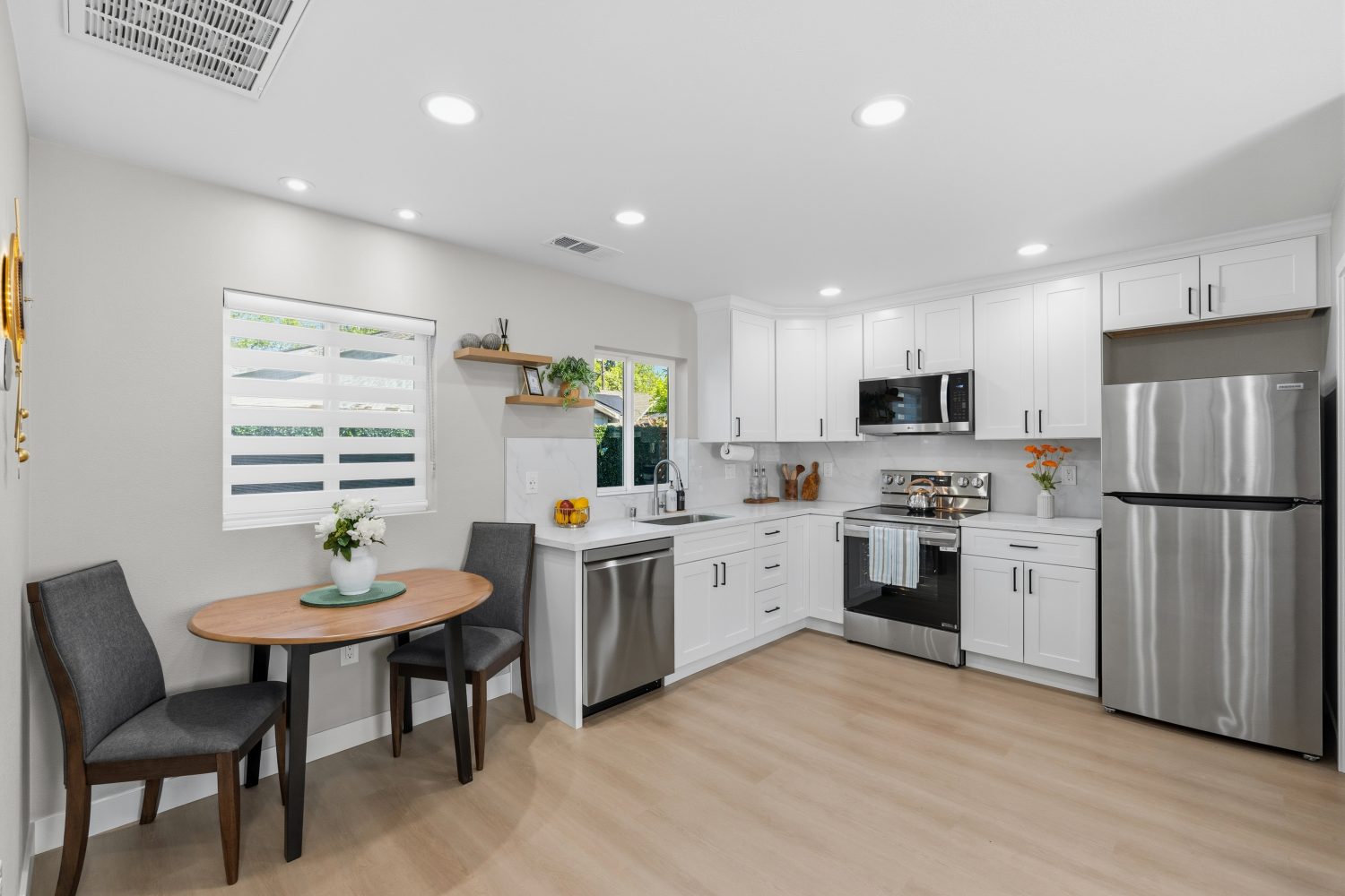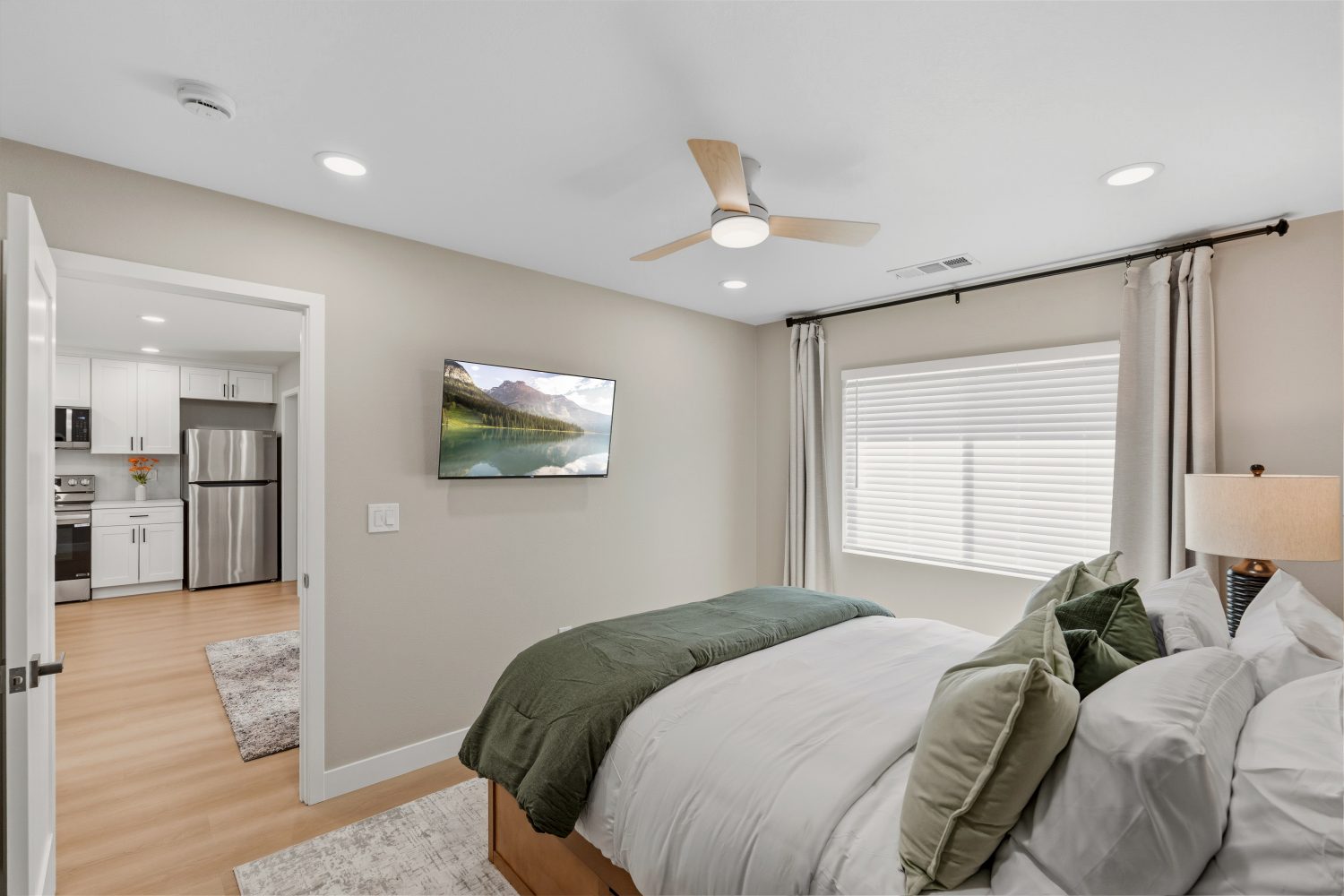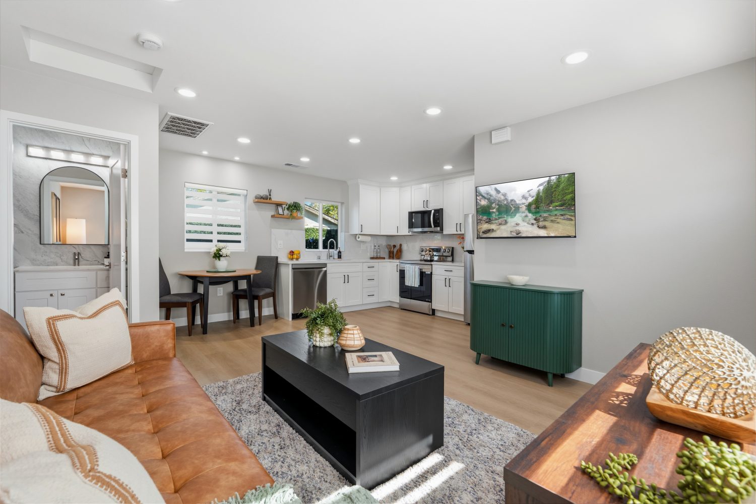 Enjoy modern amenities: central AC, smart thermostat, work area, high speed Wi-Fi, fully stocked kitchen with new appliances, luxurious bathroom, comfortable bedroom, smart TVs throughout, and ample storage.