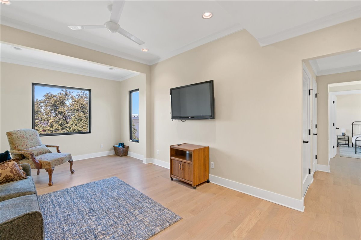 Immerse yourself in a luxurious experience from the moment you step into our grand entrance. The high ceilings and flood of natural light accentuate the house’s spaciousness, creating an airy and welcoming environment. Indulge in our lavish, private, 3-room primary suite that features a unique copper bathtub. Many windows offer captivating glimpses of Austin’s dynamic downtown skyline.