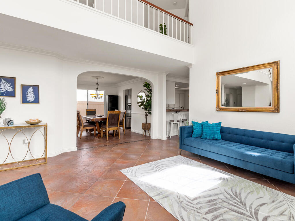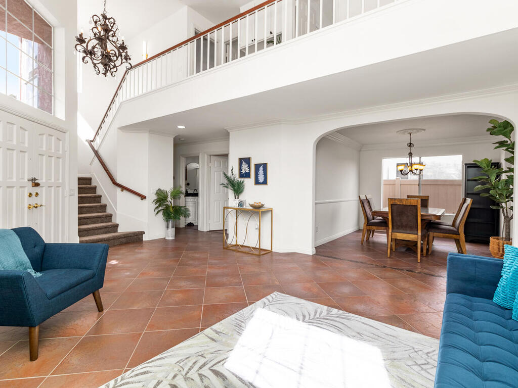 Relax with the whole family at this peaceful place to stay. This bright and spacious home has Canyon Views & back gate access to well-maintained Walking & Biking Trails. Close to popular shopping centers, parks, schools, and restaurants & only 8 miles from the beach! 4 Bedrooms, and 3 bathrooms; 1 bedroom and bathroom is on the main floor. The primary suite has a large canyon view deck. The open floor plan with vaulted ceilings & large windows provides an abundance of natural light. Home is equipped with solar panels.