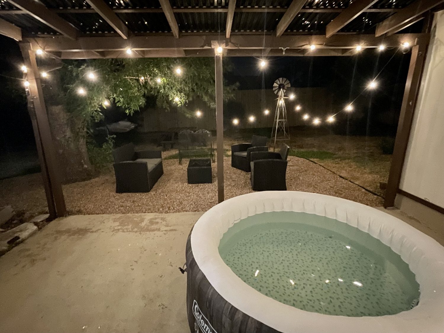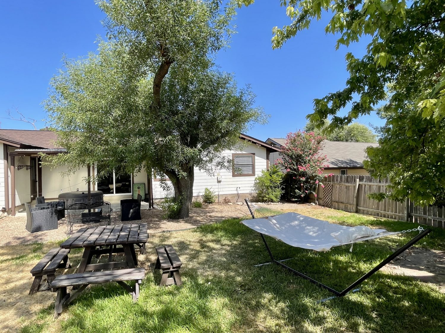 Large open floor plan with a stone fireplace makes this space great for families. Peaceful, partly shaded and well-lit yard features a covered patio, hut tub, outdoor sofas and table, benches and picnic table, and a 2-person hammock. An 8' fence offer a complete sense of privacy. Complimentary coffee and tea bar and smart TV access. Minutes from HEB and major Austin area highways.