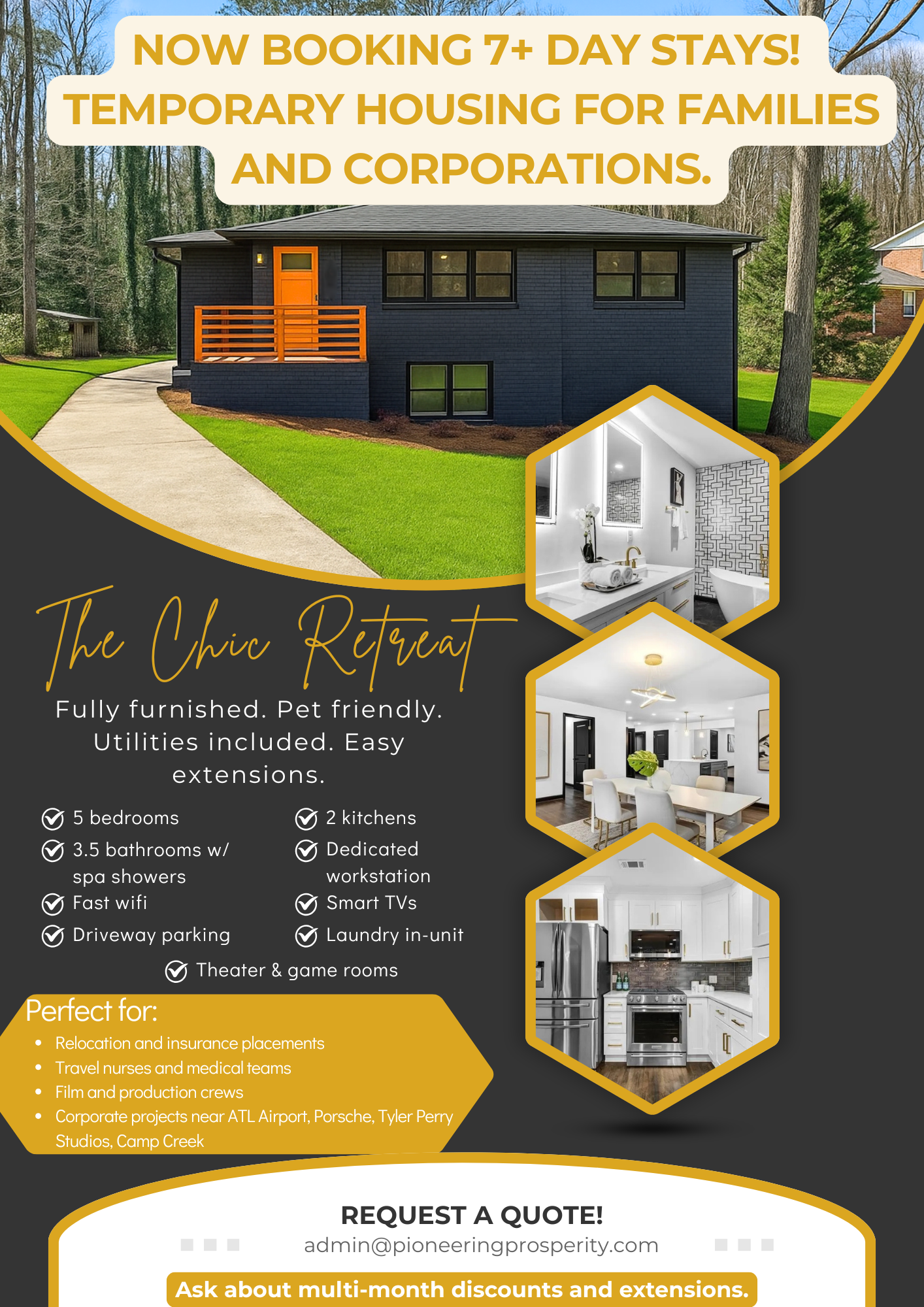 Turnkey solution for relocation, corporate stays, and policyholder housing. Rates are flexible depending on length and terms of stay.