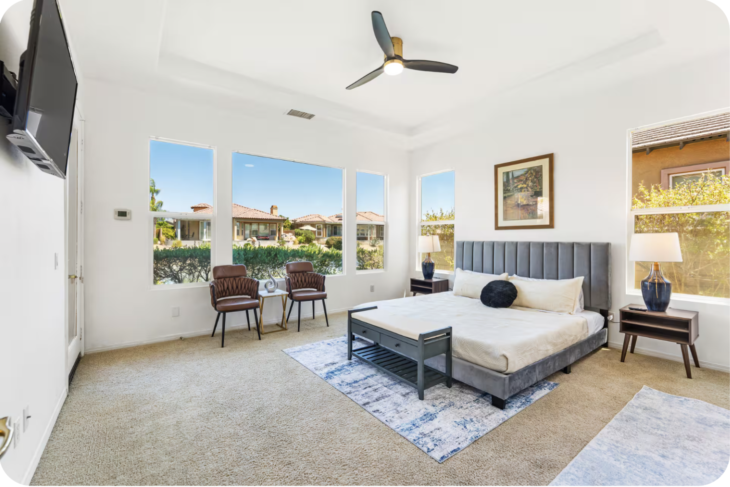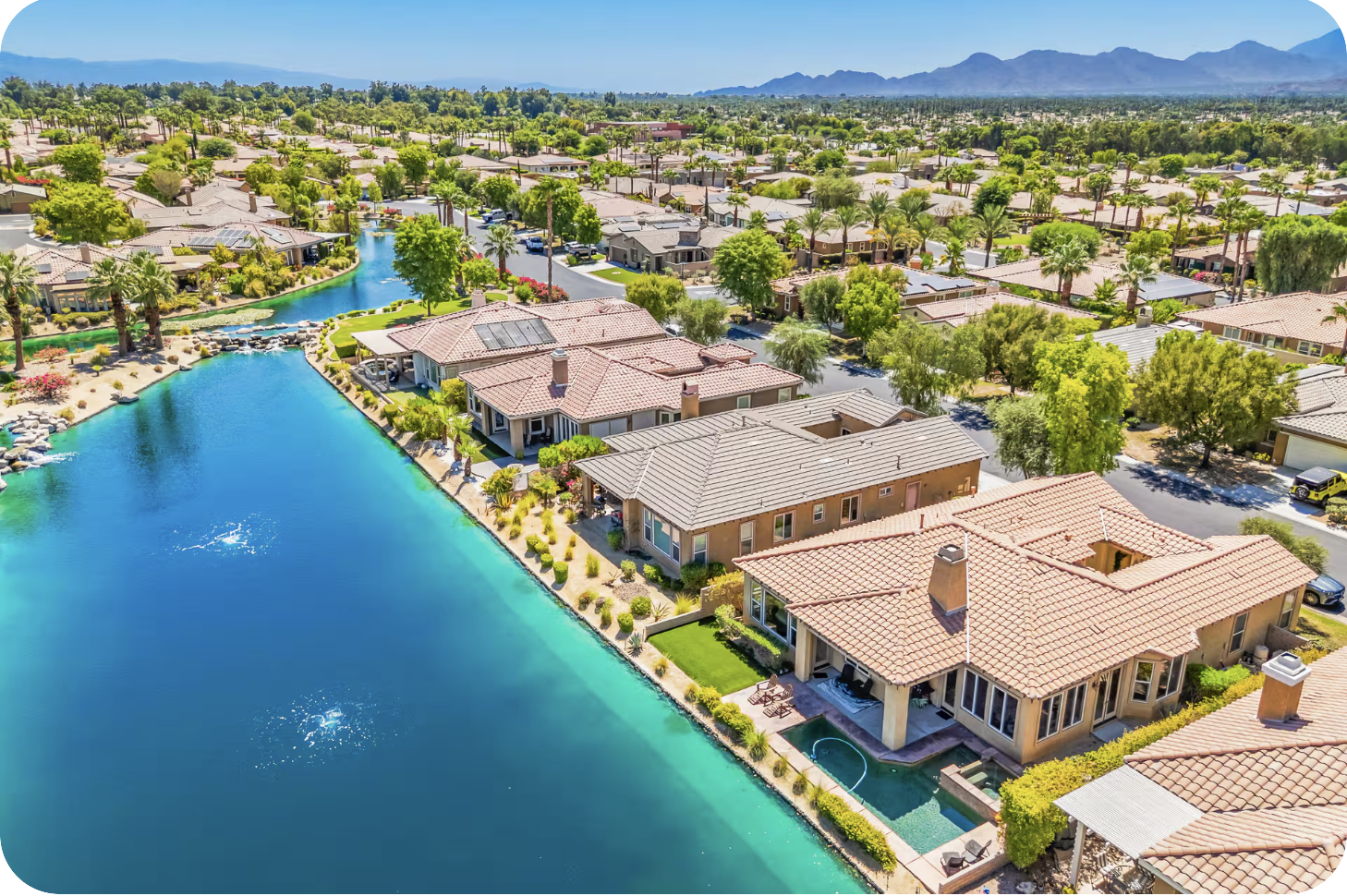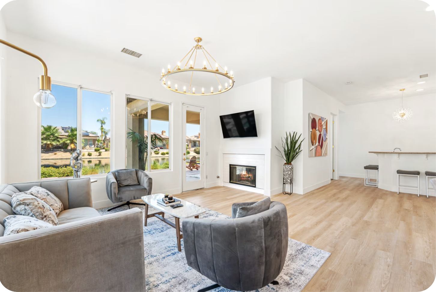 Welcome to *The Desert Lakehouse*, your private oasis right on the water in the exclusive gated community of Mission Shores. This furnished home has 4bed/3bath PLUS an office. This luxury seasonal retreat has brand new flooring, new paint, Calacatta quartz bathroom vanities, chef's kitchen, big screen TVs, designer furnishings, custom one-of-a-kind artwork, new chandeliers, wet bar, pool/spa, bbq, artificial grass, EV charger in garage, & smart home features. A truly rare find with 4 bedrooms on the lake with pool/spa! Book now before this one goes.
