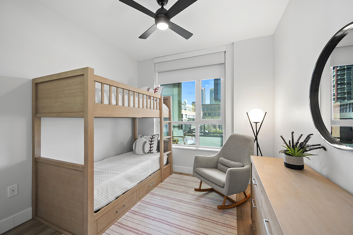 A true dream for baseball fans, this amazingly situated townhome allows you to watch baseball games at Petco Park and concerts at Gallagher’s Square all from the comfort of one-of-three private patios, providing a front-row seat to some of downtown’s most iconic attractions. The unit is suffused with natural light throughout its three stories, with large windows providing illumination and glimpses of Petco Park’s verdant fields from every level. Chic, modern finishes and furnishings make for an uncluttered yet welcoming space. An inviting king-size bed is the focal point of the primary bedroom suite, that also boasts two double-door closets, an en-suite bathroom with a dual sink vanity, a spacious walk-in shower, and a covered private patio with lounge seating. The baseball-inspired guest bedroom features sturdy bunk beds, perfect for those traveling with a group. While the third-floor loft offers a designated workspace, ideal for those working from home, and a well-appointed roof-top patio with phenomenal views of Gallagher Square. This space can also be utilized as a third sleeping area, with a queen-size sofa bed, nightstands, and a dresser, along with a stairwell door that closes off the space to allow for full privacy. If you are looking to be right in the middle of all that downtown has to offer but still value your privacy and relaxation, this is the exact home for you.