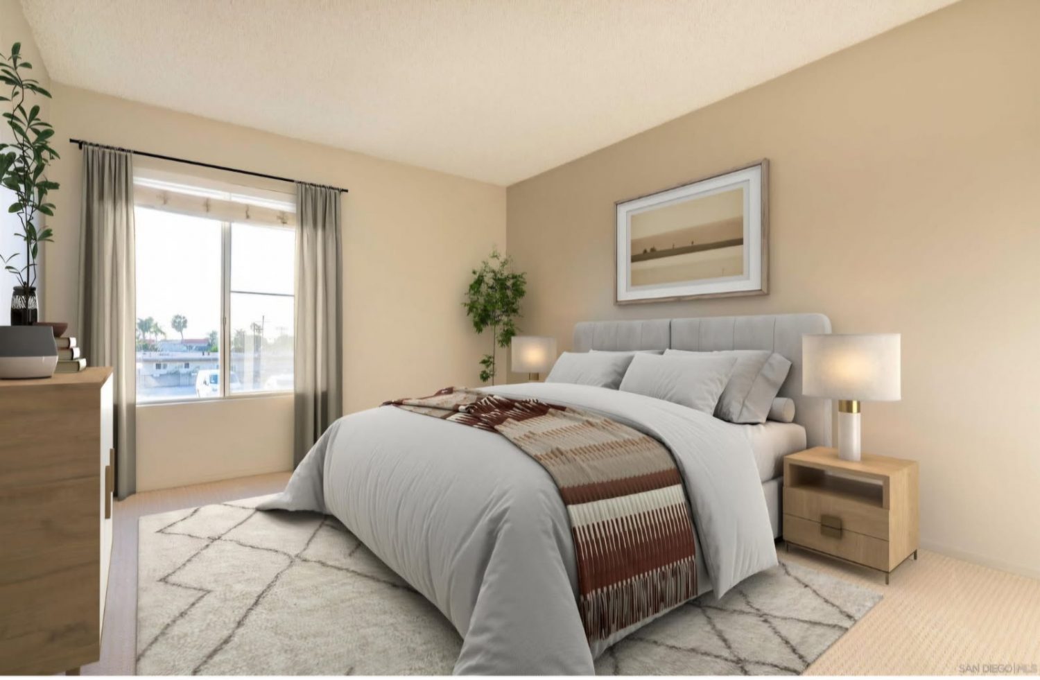 Welcome to a tropical Oasis in the heart of Pacific Beach. Only 10 blocks from the ocean and walking distance to restaurants, bars and stores such as Vons, Trader Joe’s, CVS, Bruegger’s Bagels and Broken Yolk Café. Enjoy watching sunsets, bay and ocean views from your large 2nd floor balcony. Inside this corner unit there are 2 separate primary bedroom suites positioned on opposite sides for ultimate privacy with ample closet space and their own private bathrooms. You will enjoy a fully furnished living space with king beds oversized modular couch, 75” smart tv faux fireplace with heat, upgraded kitchen, brand new appliances, dining room and breakfast counter with stools. Bathrooms include brand new vanity, sinks, and mirrors. Recessed lighting and ceiling fans throughout. All kitchenware, bedding and games included. Just bring your clothes and relax. This home offers resort style amenities that include multiple heated pools, hot tubs, saunas, fitness center, tennis courts, billiards room, library and a serene lagoon surrounded by a tropical landscape. There are many gas grills for your use throughout the property and laundry is conveniently located 50 feet away. Included is 1 parking space and access to an additional spot if needed. The grounds are secured with facial recognition or key entry and 24x7 security. Medium and long term lease available.