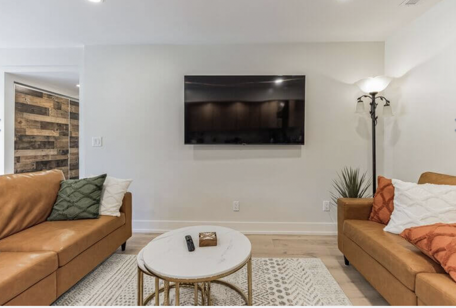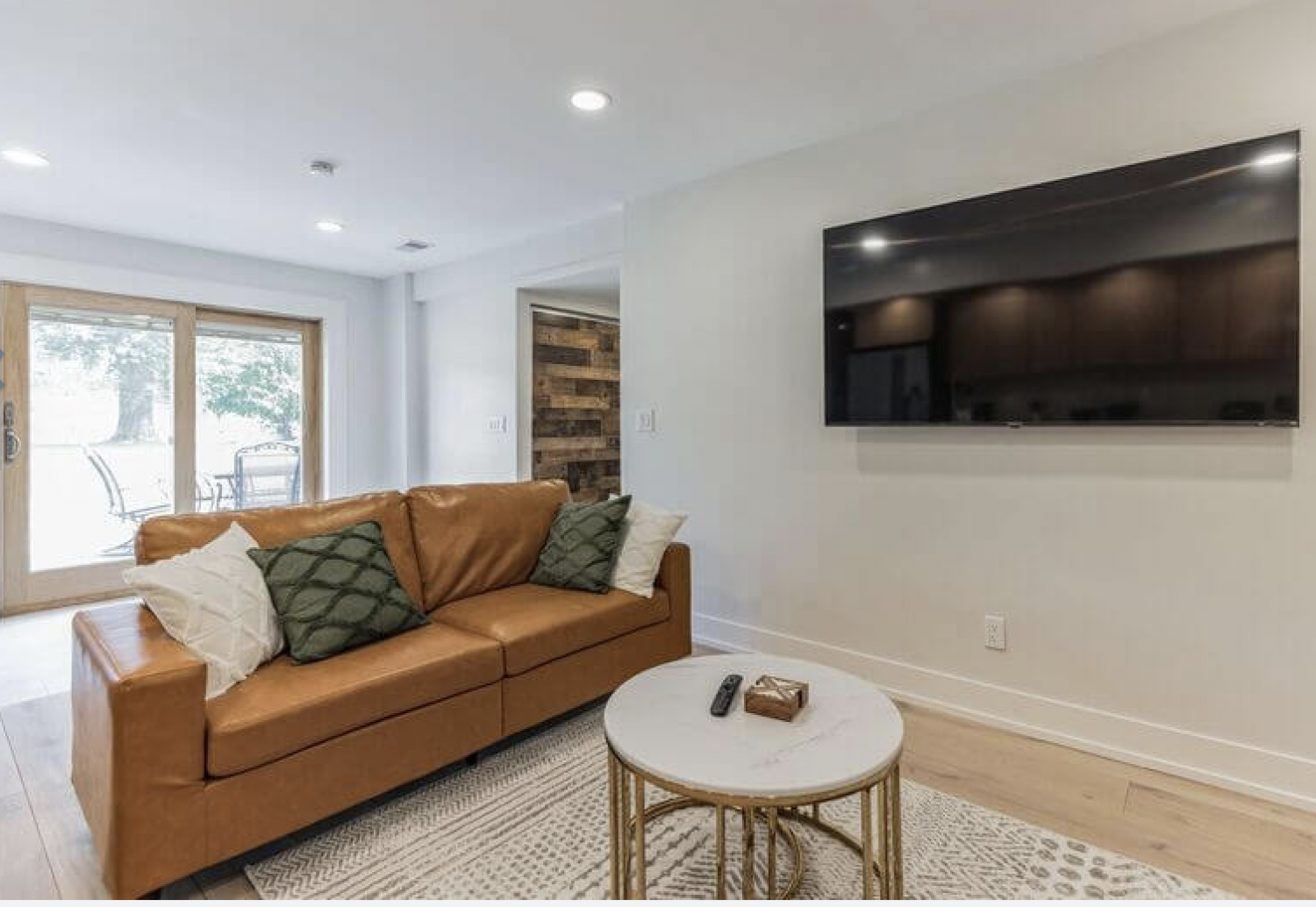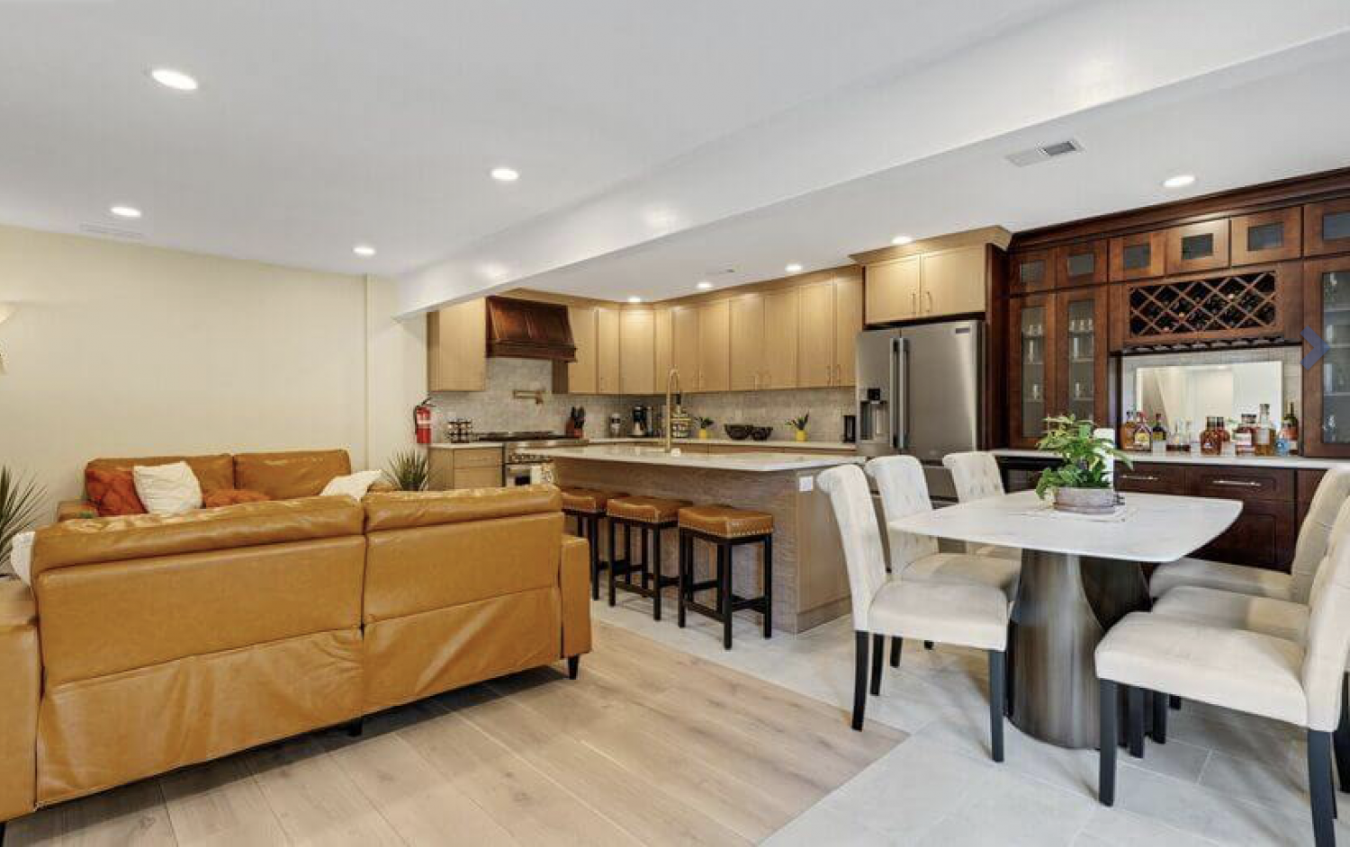 Durable, easy-to-clean floor tiles in the kitchen and dining area ensure that maintaining the space is a breeze, while the wide plank oak floors in the living area add warmth and sophistication. The living room is furnished with elegant leather couches, island stools, and an exquisite dining table set, creating a perfect environment for relaxation and dining.
