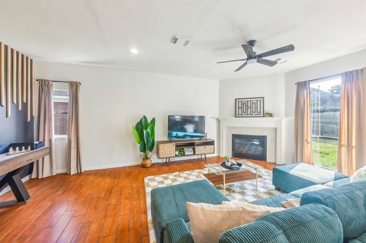Welcome to the Vintage Texan rental, your perfect getaway in Cypress, TX! Located in a quiet cul-de-sac, this charming 5-bedroom, 3.5-bath home offers comfort, convenience, and all the amenities you need for a memorable short or mid-term stay. The house sits on an oversized lot at the bend of the road, providing a peaceful and spacious retreat for families, groups, or business travelers. Upon entering the neighborhood, you’ll immediately notice the serene atmosphere, ideal for a relaxing stay away from the hustle and bustle of the city. Parking is a breeze, with a two-car garage and a large driveway that can accommodate up to four cars. There's also ample street parking available. The front yard, adorned with a beautiful palm tree and well-lit landscaping, creates a warm and inviting welcome. Your arrival will be seamless, thanks to our Yale smart lock, pre-programmed with the last four digits of your phone number. This convenient feature ensures that accessing the home is effortless throughout your stay. As you step through the front door, you’re greeted by a cozy sitting area, perfect for luggage drop-off or a moment to relax. Here, you’ll also find a welcome gift and our house manual with all the information you need to make your stay as smooth as possible. The front sitting area leads into the open and airy dining room, which is spacious enough for large family meals or gatherings with friends. The dining area flows seamlessly into the beautifully updated kitchen, which is fully stocked with everything you’ll need for your stay. Whether you're preparing a gourmet meal, brewing a fresh cup of coffee in the morning, or stocking the fridge and pantry with snacks, the kitchen is designed to accommodate every culinary need. Stainless steel appliances and ample counter space make meal prep a breeze. Just around the corner, you'll find the main living room downstairs. This open-concept space features a cozy U-shaped sectional, a large TV, and a beautiful remote-controlled fireplace, perfect for relaxing after a long day. The shuffleboard table adds a fun element to the space, inviting friendly competition among guests. From the living room, you can easily access the backyard, making BBQ season that much easier. At the front of the house, the staircase takes you to the second floor, where the space splits into two wings. To the right, you'll find the game room, complete with a pool table ready for your next match. This side of the house also features a private bedroom with a queen bed and its own ensuite bathroom, complete with a walk-in shower—ideal for guests seeking extra privacy. On the left side of the second floor, you’ll discover a cozy upstairs living room, thoughtfully designed with kids in mind. It features a comfortable modular sleeper sofa, a TV, and a soft, washable rug. This room provides a perfect space for younger guests to relax and watch their favorite shows or movies. Off this living room is the primary bedroom, your own personal sanctuary during your stay. This luxurious room includes a king-size bed, a sitting chair, and a TV for unwinding with a good movie or show. The en-suite bathroom is equally impressive, featuring a large soaking tub, a walk-in shower with a rainhead, and a double vanity. You'll have plenty of storage space with a walk-in closet and dresser, ensuring you can unpack and feel right at home. The primary suite also includes a dual-purpose room just off the bedroom. This additional space is furnished with a full-size daybed and a sit/stand desk, perfect for anyone needing a quiet workspace. The 43-inch TV in this room can also double as a monitor if needed. On the opposite side of the upstairs living room, you’ll find two additional bedrooms and a third bathroom. One bedroom is equipped with a king-size bed, while the other features a queen-size bed. Both rooms include smart TVs and sit/stand desks, offering even more work-from-home options. The shared bathroom on this side has a full-size tub and shower combo, ensuring all guests have access to everything they need for a comfortable stay. Now, step outside into the backyard, where a brand-new concrete slab has been poured to create the ultimate outdoor oasis. The backyard is fully fenced, making it a safe and fun space for children and pets to roam freely. A string of lights surrounds the outdoor area, creating a cozy and inviting atmosphere for evenings under the stars. A large 7-person inflatable hot tub awaits you, perfect for relaxing after a long day of exploring or working. Gather around the fire pit, which seats six comfortably, and enjoy a night of conversation and s’mores with family or friends. In addition to the hot tub and fire pit, the backyard includes a BBQ area complete with a charcoal grill and smoker for all your outdoor cooking needs. The outdoor dining space provides plenty of seating for meals al fresco, making this area ideal for BBQ season.