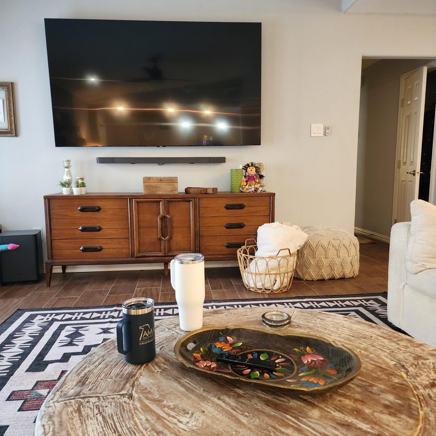 Designer $10,000 living room couch for premium comfort, 85" TV with sound system