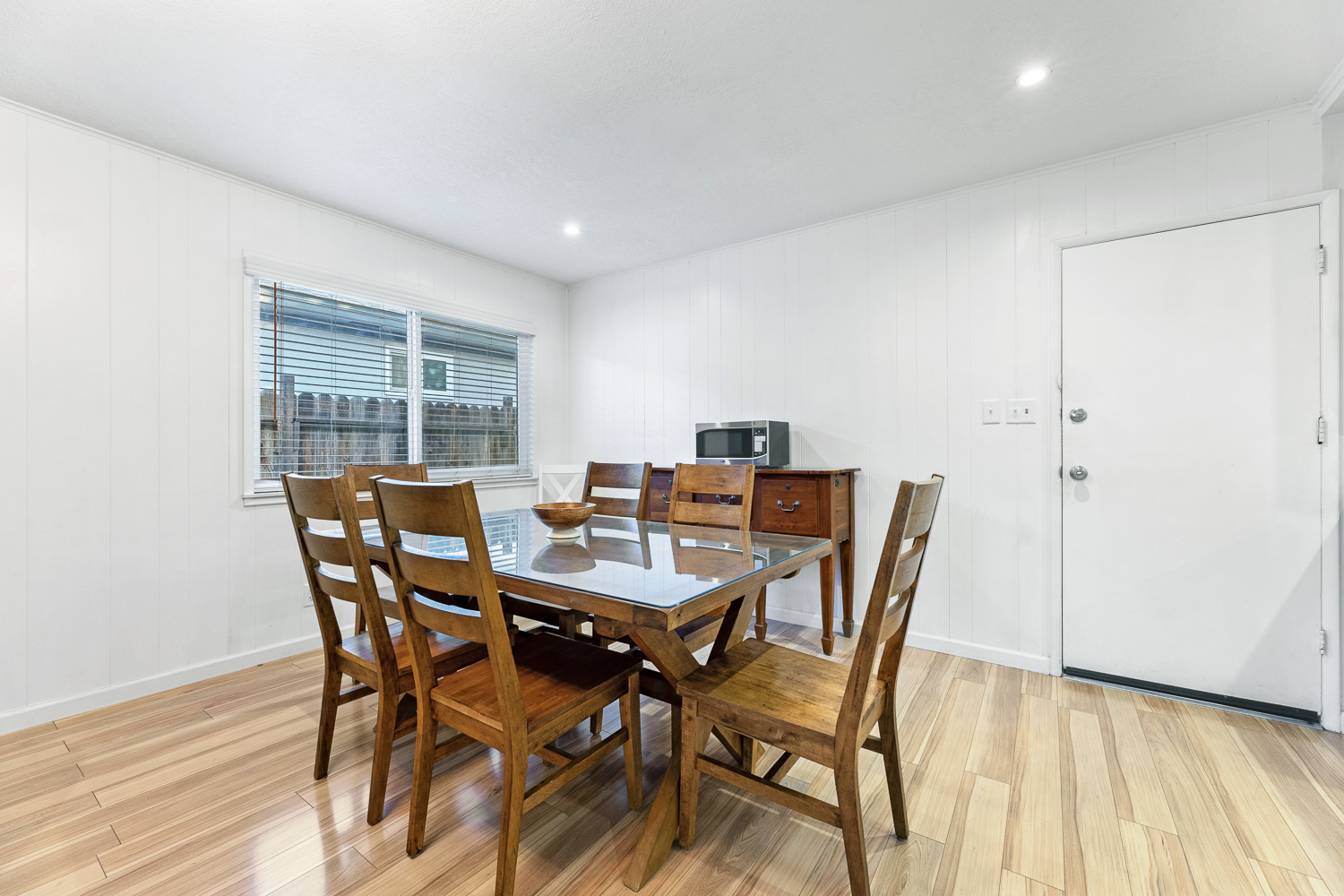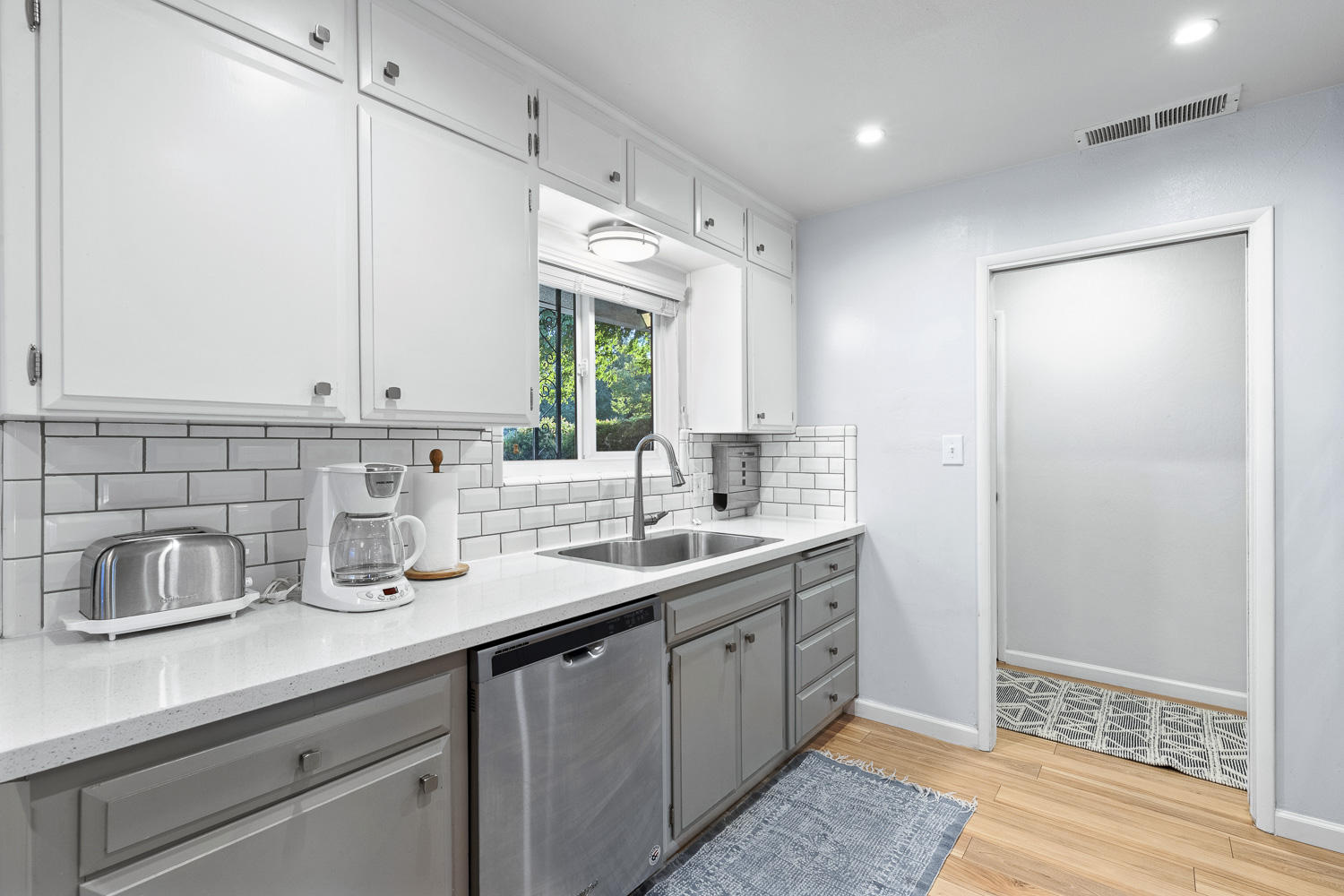 The newly remodeled kitchen boasts quartz countertops, stylish two tone cabinets and clean modern stylings. The kitchen is fully equipped with all the cookware and appliances you would need to cook any meal.