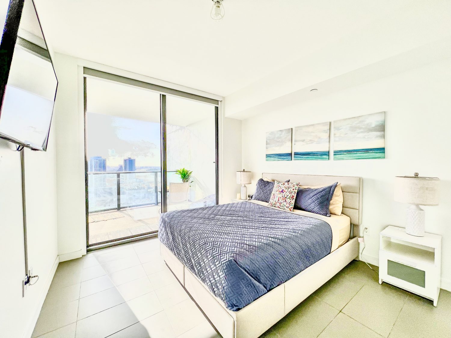 Lunabase's Tropical Refuge offers a serene and luxurious living experience for digital nomads, remote workers, and traveling nurses looking for an extended stay in Miami. Situated on the 22nd floor, this modern condominium boasts a stunning view of the ocean bay and city, on the edge of Wynwood in downtown Miami, just under 5 miles from South Beach.