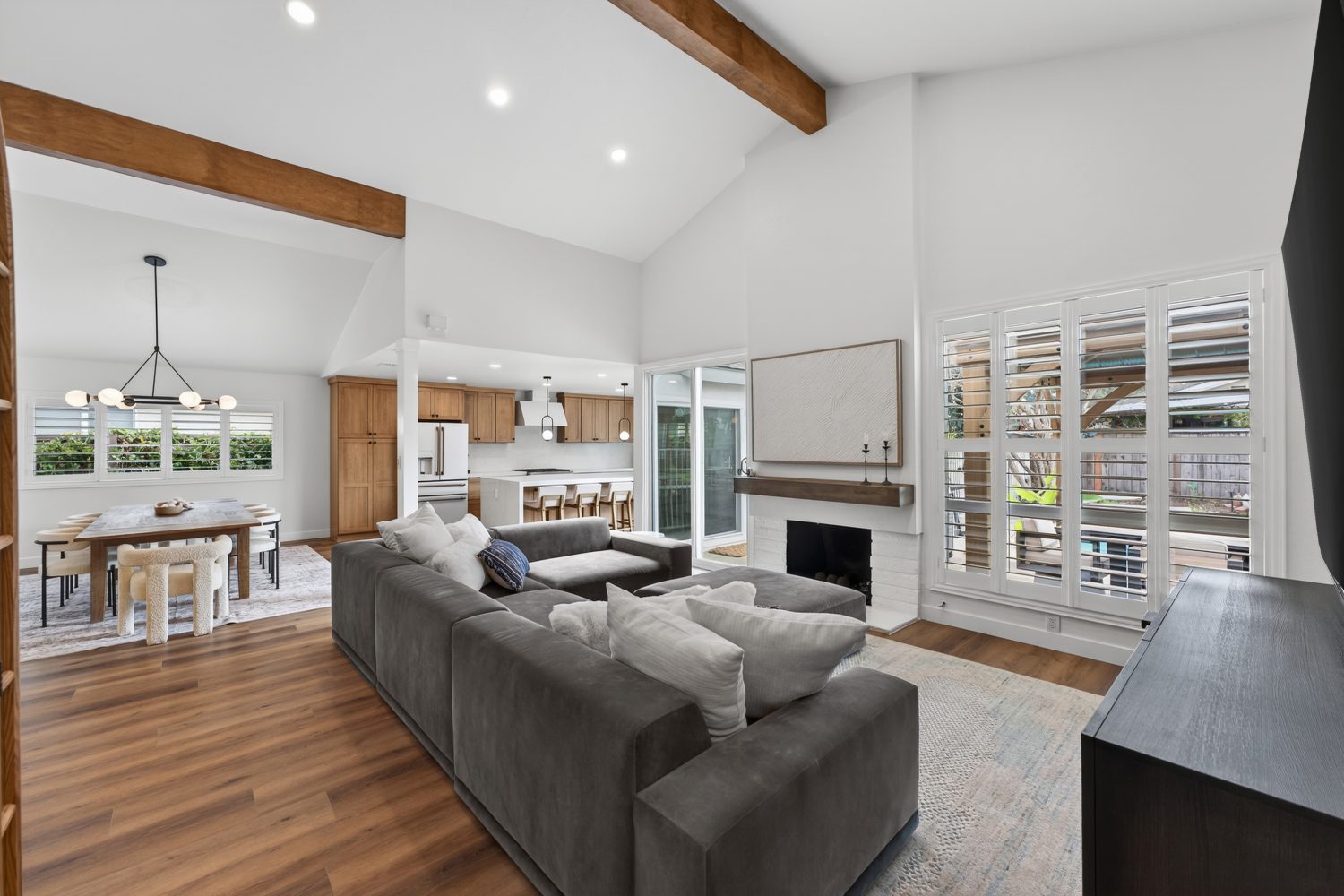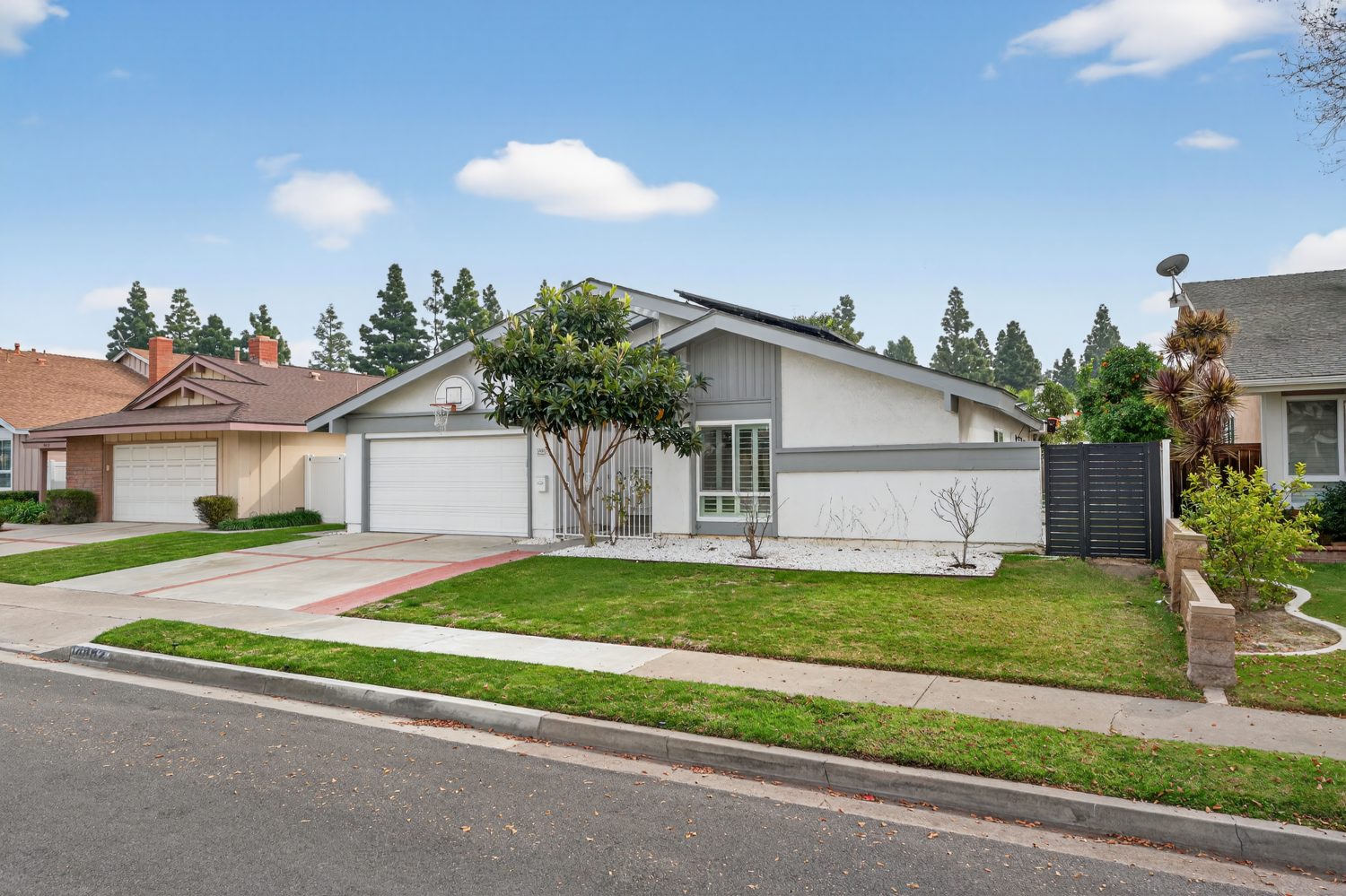 Welcome to your beautifully refreshed pool home in the sought-after Tustin Meadows Community! This single-level gem features new laminate flooring, fresh interior paint, updated light fixtures, and more thoughtful designs throughout. Soaring vaulted ceilings and abundant natural light create an airy feel in the formal living and dining rooms, anchored by a cozy fireplace—perfect for relaxing or entertaining. The spacious primary suite offers vaulted ceilings and a private en-suite bath. Two additional bedrooms and a full hallway bath provide ideal flexibility for family, guests, or a home office. The open kitchen flows into a casual living area and includes new butcher block counters, a wide single-bin sink, and updated appliances—great for everyday living or hosting. Step outside to a private backyard retreat with a fenced-in pool, diving board, lush lawn, and mature fruit trees including oranges, loquats, sweet lime and pomegranates. Solar panels add energy efficiency and long-term savings. Enjoy all that Tustin Meadows has to offer: two pools, a clubhouse, basketball & volleyball courts, playgrounds, and beautifully maintained Centennial Park. Community favorites like the Easter Egg Hunt, 4th of July Parade, Dolphin Swim Club, and Tiny Tots Preschool make this a truly special place to call home.
