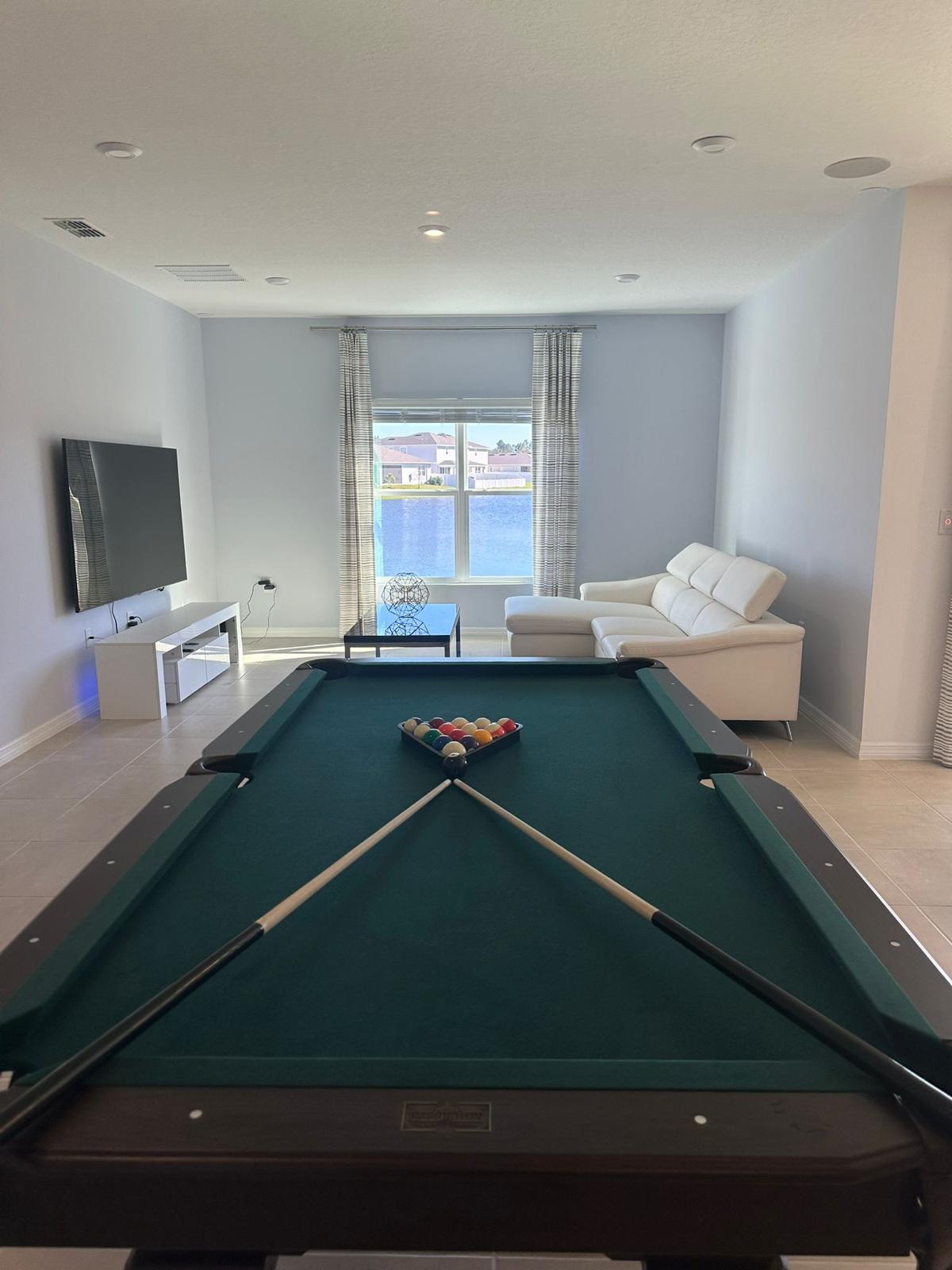 Fully furnished Beautiful home for long and midterm term rental! This spacious residence has 4 bedrooms and 2 bathrooms, with the capacity to accommodate up to 10 people comfortably. Each bedroom is equipped with TVs for your entertainment, with an impressive 65-inch TV in the master bedroom, a 65-inch TV in the living room, and 55-inch TVs in the other bedrooms. and an incredible pool and darts table. The house comes fully furnished and equipped with all the necessary amenities, from sheets and duvets to towels and kitchen utensils. The kitchen is equipped with modern appliances, coffee maker, toaster, waffle maker, rice cooker and everything you need to prepare delicious meals. Additionally, the house has a carbon monoxide alarm and smoke alarm for your safety. With ample parking for 4-6 cars, including an internal two-car garage, you'll have more than enough space for your vehicles. Enjoy stunning lake views from the balcony, and relax in the condo's pool or children's park. Centrally located, you'll be close to numerous attractions, including Orlando International Airport just 25 minutes away. Plus, you'll be just a short drive from Universal Studios, Magic Kingdom Park, the Lake Nona business district, and Walmart - all just minutes away! Don't wait any longer and make this house your home in st cloud.