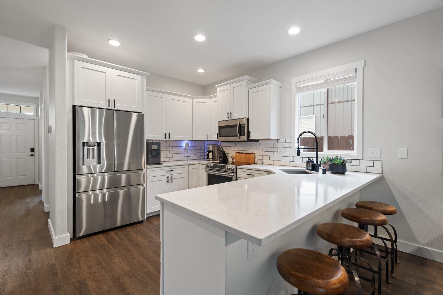 4 bedroom 2.5 bathroom home with large back patio with hot tub and seating! This new construction home has brand new furniture and appliances and is a more high end experience with new fixtures and updated decor. Fully furnished and fully equipped kitchen make this space perfect for extended stays and large families. There is one bedroom on the bottom level and the other three require stairs to access.