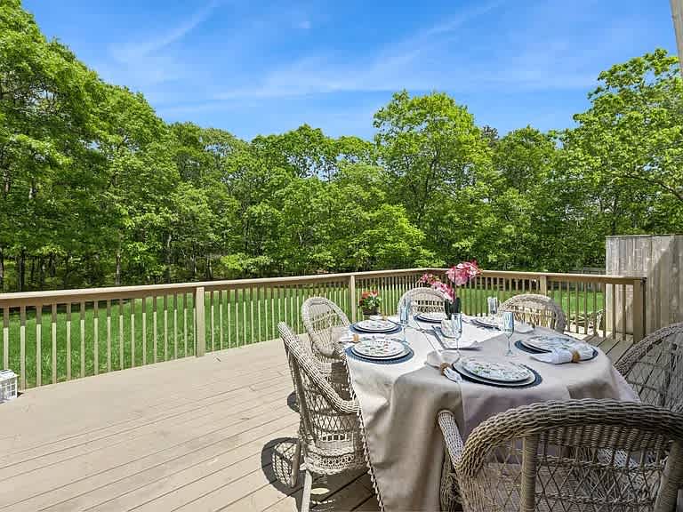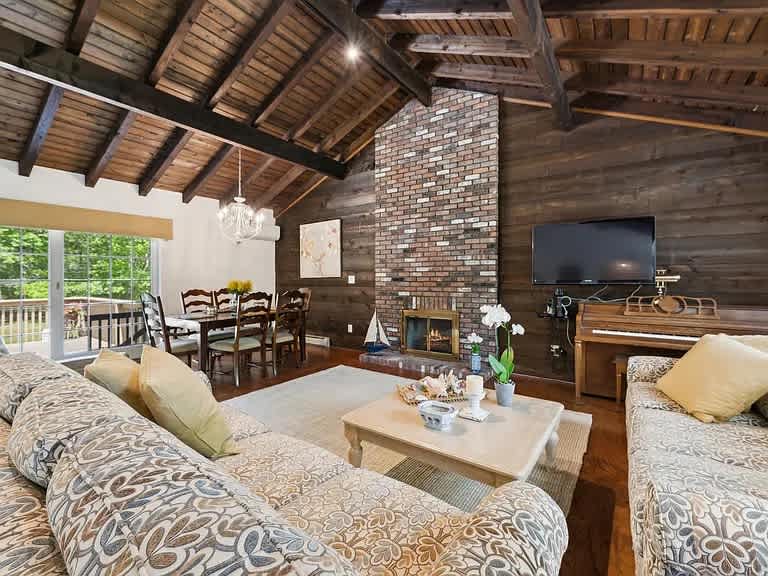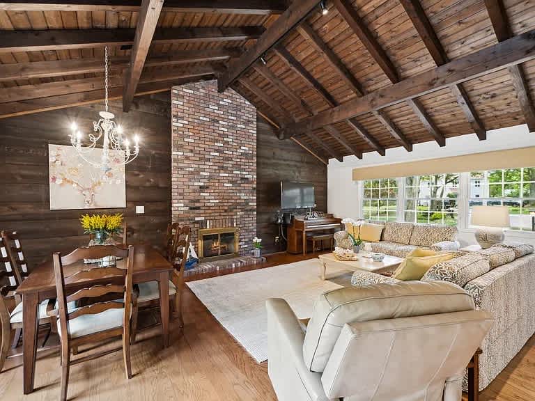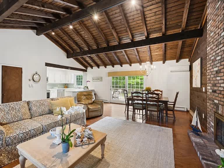 Hampton Bays cottage with vaulted wood-beam ceilings, a floor-to-ceiling brick fireplace, and a renovated kitchen. Three bedrooms and two full baths on a single level with no interior stairs. Large private yard and spacious deck for outdoor dining. Minutes to Tiana Beach, Ponquogue Beach, and Shinnecock Canal.
