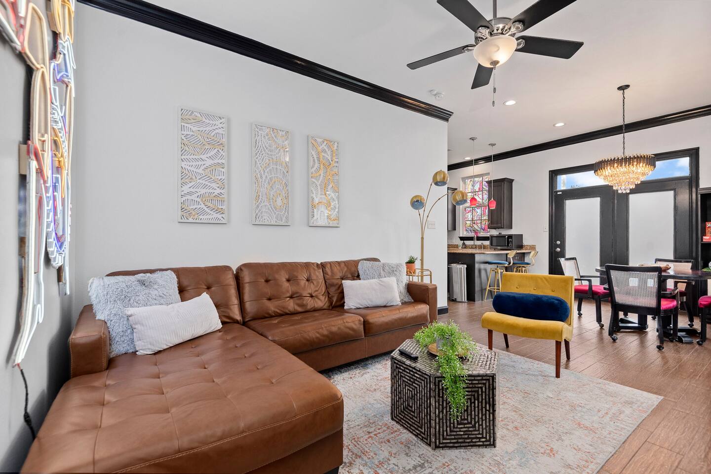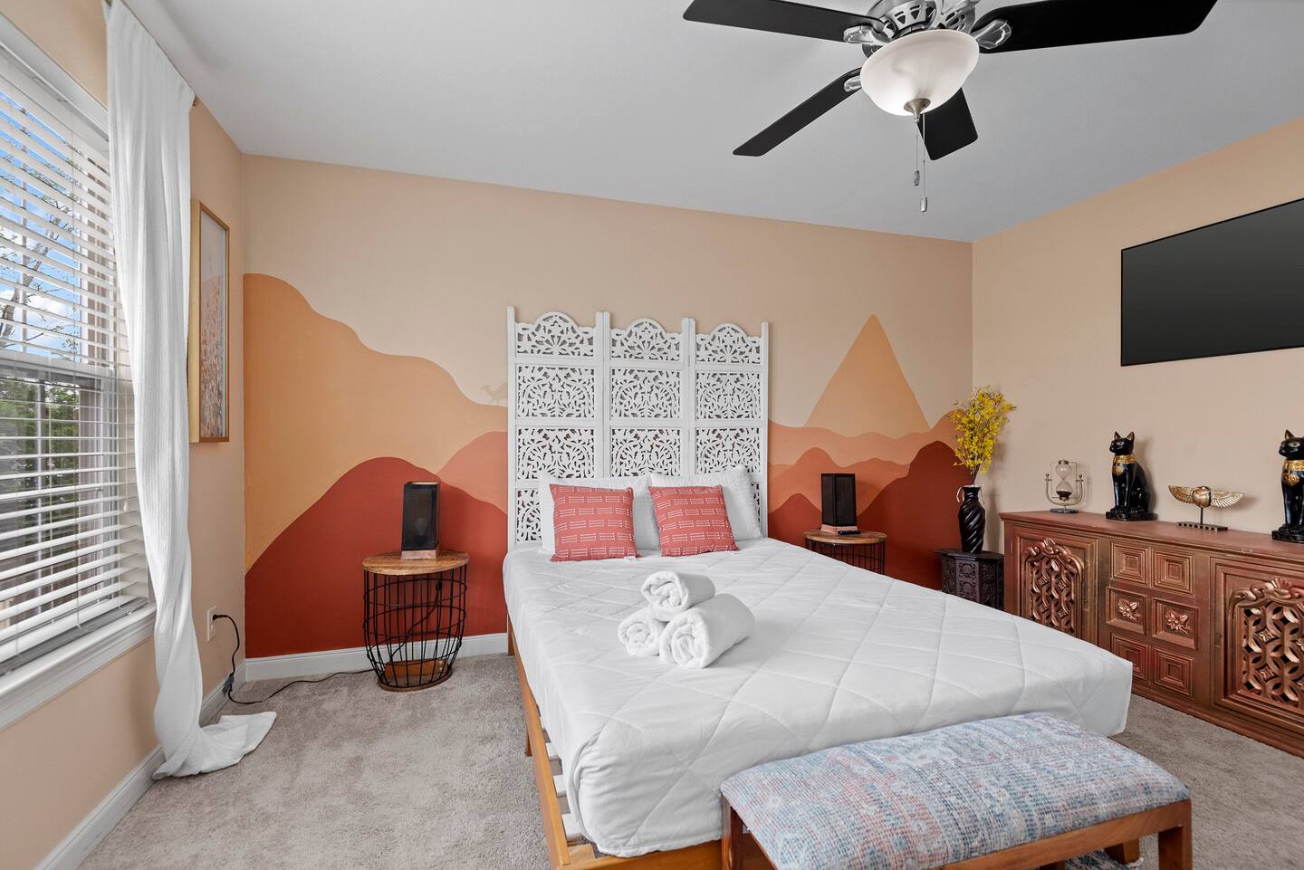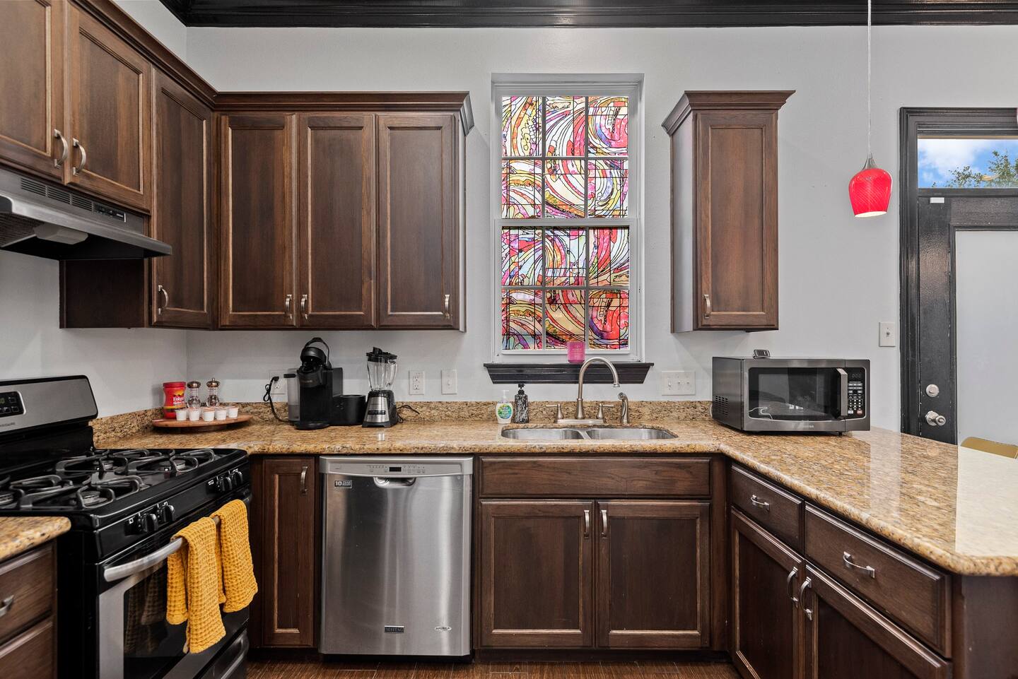 Unwind in Style: Relax in the hot tub under the pergola, surrounded by vibrant decor, or enjoy game nights in the backyard with cornhole, jumbo connect four, and more.