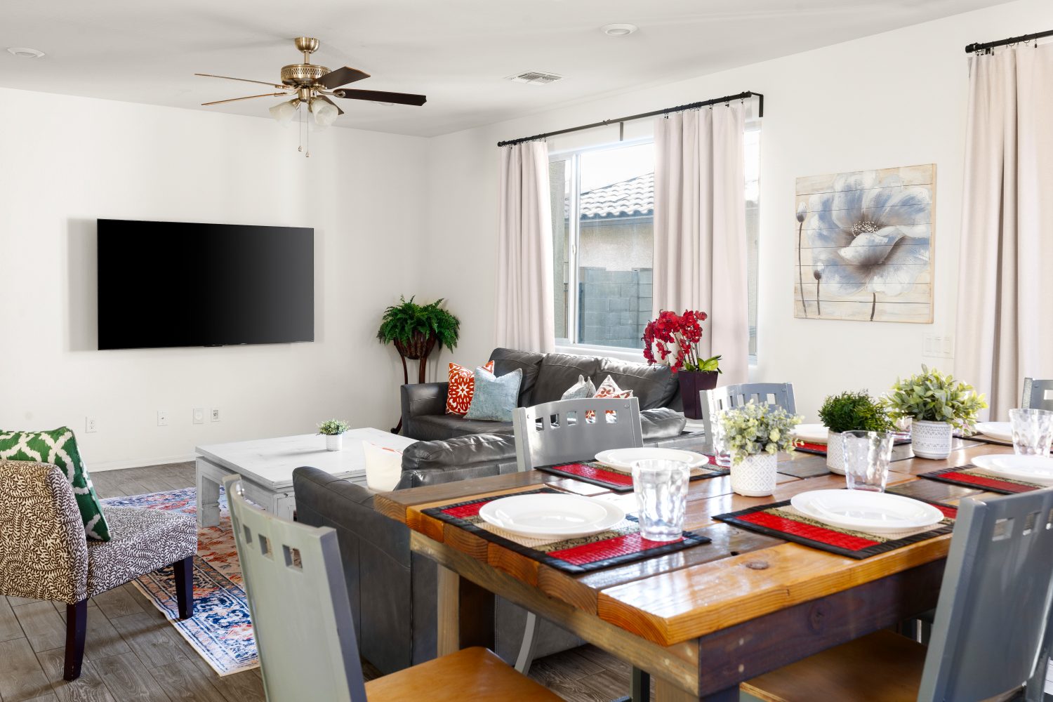 This spacious 5 Bedroom Goodyear retreat offers comfort and style just minutes from golf, dining, and hiking. This is the PERFECT accommodation for large groups needing mid stay accommodations. Relax in the open living spaces, walk over to the community pool & make memories, strike up some intense pool matches, or whip up meals in the fully stocked kitchen.
