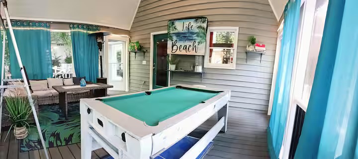 The home also includes access to a screened-in porch with a pool table, shared kitchen, laundry, and peaceful backyard space.